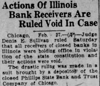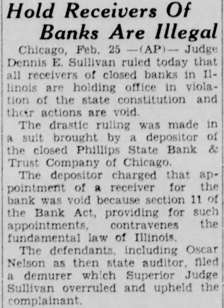 Hold Receivers Of Banks Are Illegal Chicago, Judge Dennis ruled today that closed office violathe constitution and are void The drastic made brought closed Phillips State Bank Trust Company The charged that pointment receiver for the section Bank providing the appointments, of Illinois The defendants including Oscar Nelson then auditor, filed demurer which Superior Judge Sullivan overruled and upheld