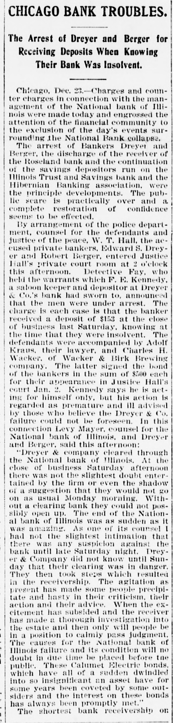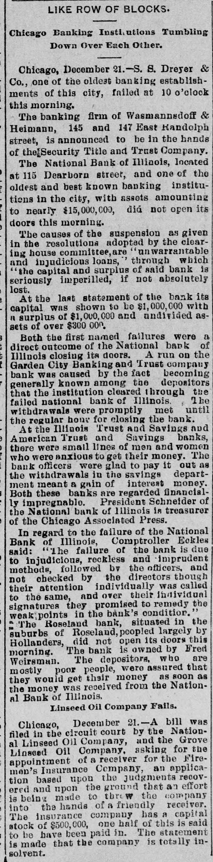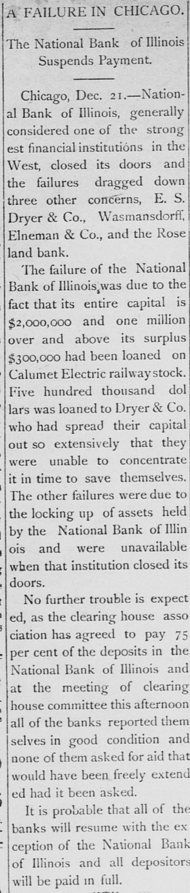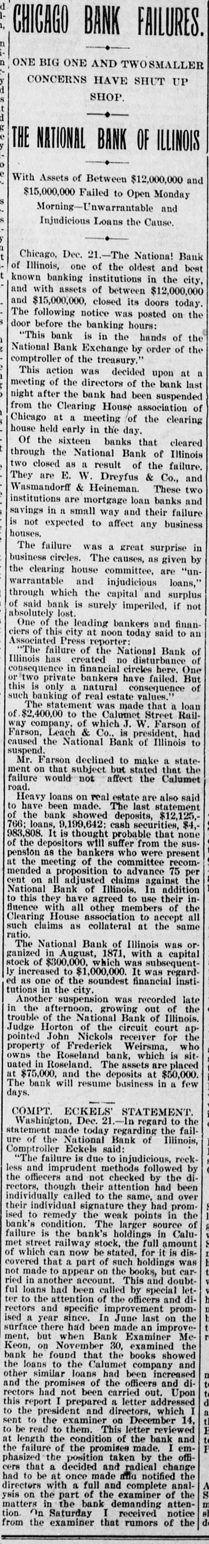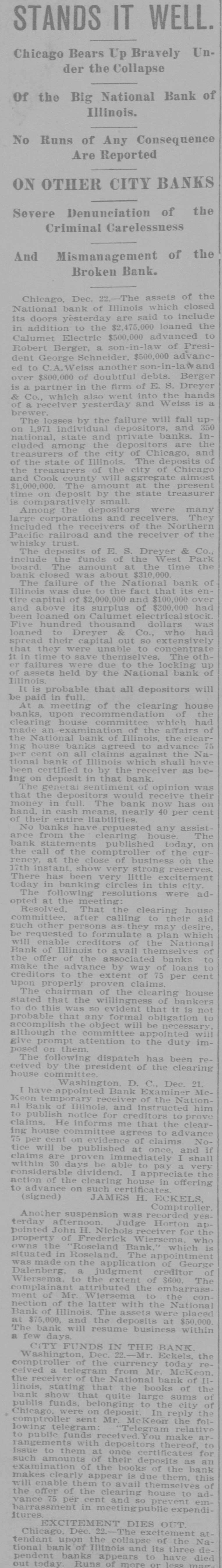 (Signed.) "JAMES H. ECKLES, "Comptroller." ROSELAND BANK SUSPENDS. Another suspension was recorded late in the afternoon, when Judge Horton, of the circuit court, appointed John H. Nichols receiver for the property of Frederick Wiersema, who owns the Roseland bank, which is situated in Roseland. The appointment was made upon the application of George Dalenberg, a judgment creditor of Wiersema to the extent of $600. The complaint attributed the embarrassment of Mr. Wiersema to the connection of the latter with the National Bank of Illinois. The assets are placed at $75,000 and the deposits at $50,000. The bank will resume business within a few days. ACCOUNTS FALSIFIED. Chicago, Dec. 21.-The Tribune tomorrow will say that in the case of the National Bank of Illinois, "the manipulation of the books was such as to practically amount to the fasification of accounts." It is claimed that one loan of $900,000 made to the Calumet Electric company was charged up to foreign exchange instead of being entered in a proper manner. Other irregularities in connection with loans made to the Calumet Electric company are said to haave taken place. IN NEW YORK. New York, Dec. 21.-Officials of the Mercantile and the American Exchange National banks of this city, correspondents of the National Bank of Illinois, say they will not be affected to any important extent by its failure. The American Exchange has merely handled collections for the bank and is actually a debtor to it. The Mercantile bank people say that the Chicago bank does not owe them except for notes in their hands for collection, and express deep sympathy for the officials of the Chicago bank. REPORTED TO ECKLES. Washington, Dec. 21.-Comptroller Eckles has received an announcement concerning the National Bank of Illinois in Chicago. It says the Chicago clearing house has assumed to pay 75 per cent of all proved claims. John C. McKean has been appointed receiver for the bank and instructed to publish a list of all approved claims at once SO that creditors may get the benefit of his action. Instructions have been issued to all banks having the bank as their correspondent to prove their claims and send them in. At the last report of this bank, which was November 30, the bank had a capital of $1,000,000; a surplus of $1,000,000; undivided profits $450,000 and total assets, including bonds, of $15,046,992. Its liabilities will be about $11,000,000. While it is feared that serious results may follow, Comptroller Eckles will do all in his bower to relieve the strain on