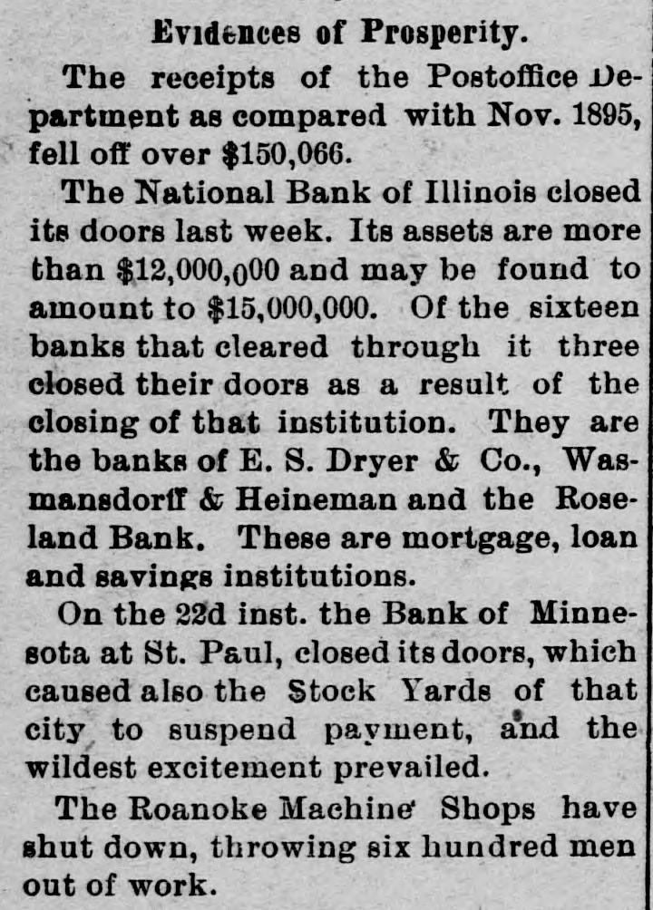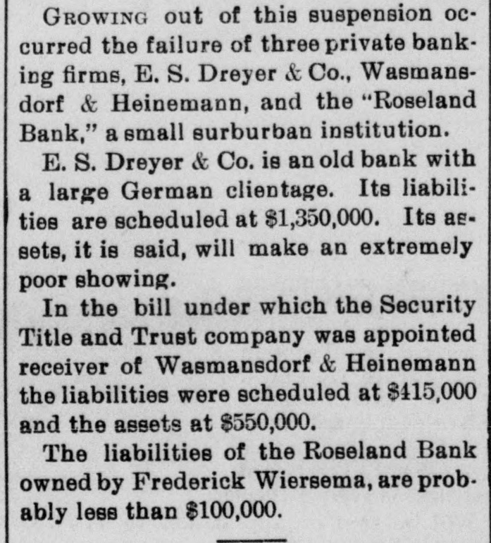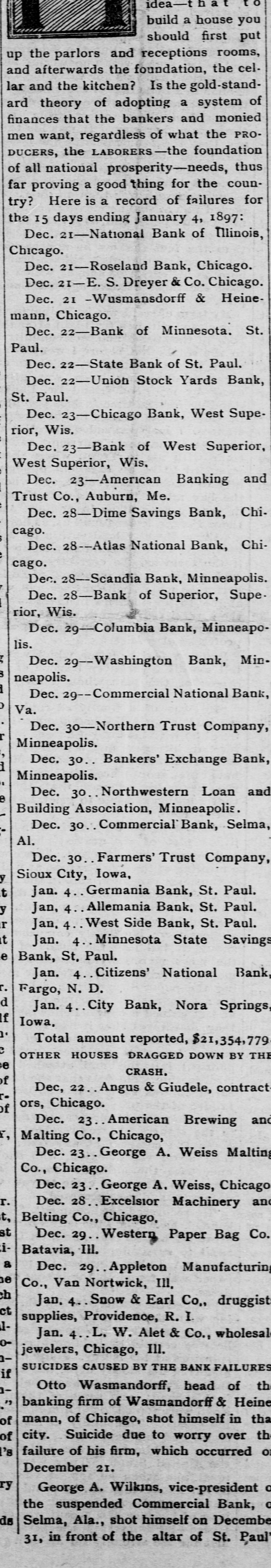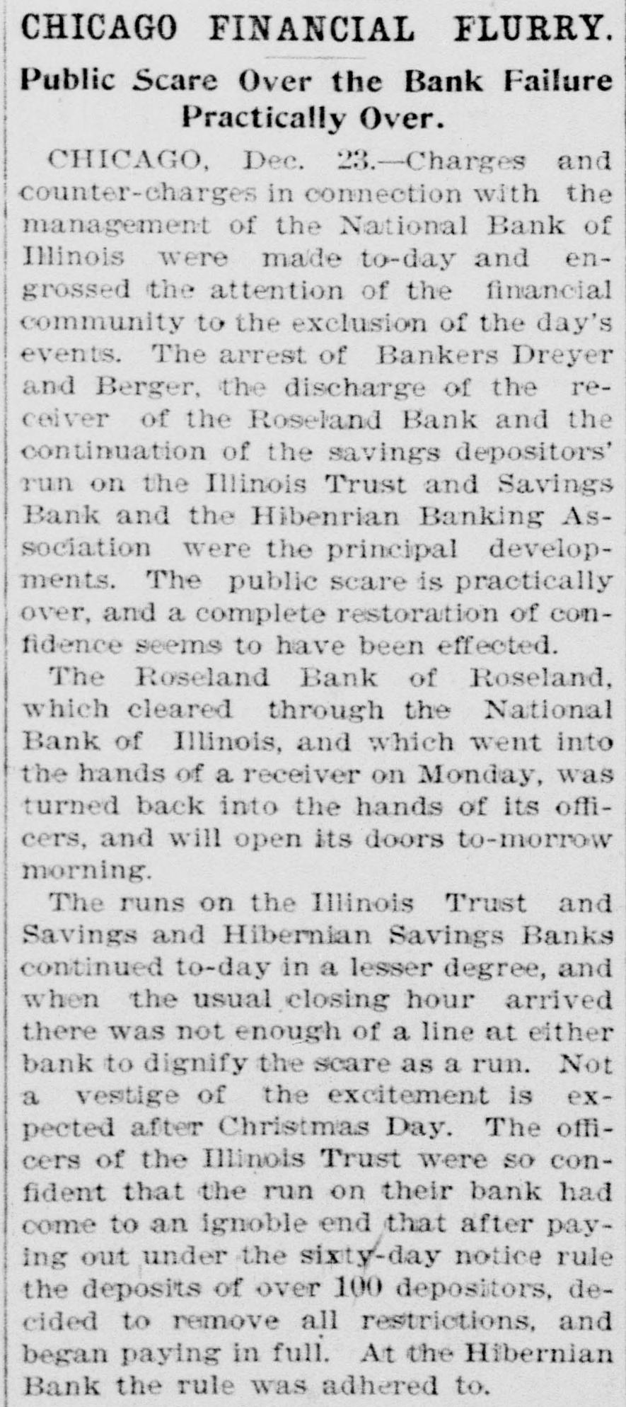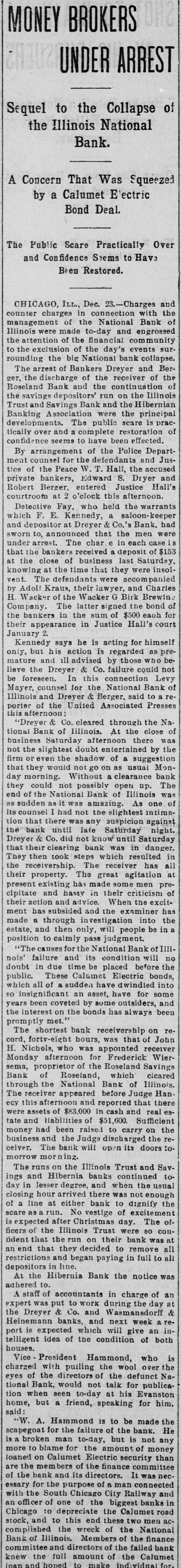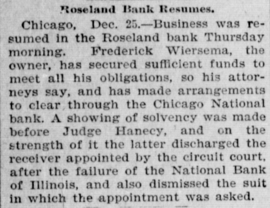(Signed.) "JAMES H. ECKLES, "Comptroller." ROSELAND BANK SUSPENDS. Another suspension was recorded late in the afternoon, when Judge Horton, of the circuit court, appointed John H. Nichols receiver for the property of Frederick Wiersema, who owns the Roseland bank, which is situated in Roseland. The appointment was made upon the application of George Dalenberg, a judgment creditor of Wiersema to the extent of $600. The complaint attributed the embarrassment of Mr. Wiersema to the connection of the latter with the National Bank of Illinois. The assets are placed at $75,000 and the deposits at $50,000. The bank will resume business within a few days. ACCOUNTS FALSIFIED. Chicago, Dec. 21.-The Tribune tomorrow will say that in the case of the National Bank of Illinois, "the manipulation of the books was such as to practically amount to the fasification of accounts." It is claimed that one loan of $900,000 made to the Calumet Electric company was charged up to foreign exchange instead of being entered in a proper manner. Other irregularities in connection with loans made to the Calumet Electric company are said to haave taken place. IN NEW YORK. New York, Dec. 21.-Officials of the Mercantile and the American Exchange National banks of this city, correspondents of the National Bank of Illinois, say they will not be affected to any important extent by its failure. The American Exchange has merely handled collections for the bank and is actually a debtor to it. The Mercantile bank people say that the Chicago bank does not owe them except for notes in their hands for collection, and express deep sympathy for the officials of the Chicago bank. REPORTED TO ECKLES. Washington, Dec. 21.-Comptroller Eckles has received an announcement concerning the National Bank of Illinois in Chicago. It says the Chicago clearing house has assumed to pay 75 per cent of all proved claims. John C. McKean has been appointed receiver for the bank and instructed to publish a list of all approved claims at once SO that creditors may get the benefit of his action. Instructions have been issued to all banks having the bank as their correspondent to prove their claims and send them in. At the last report of this bank, which was November 30, the bank had a capital of $1,000,000; a surplus of $1,000,000; undivided profits $450,000 and total assets, including bonds, of $15,046,992. Its liabilities will be about $11,000,000. While it is feared that serious results may follow, Comptroller Eckles will do all in his bower to relieve the strain on