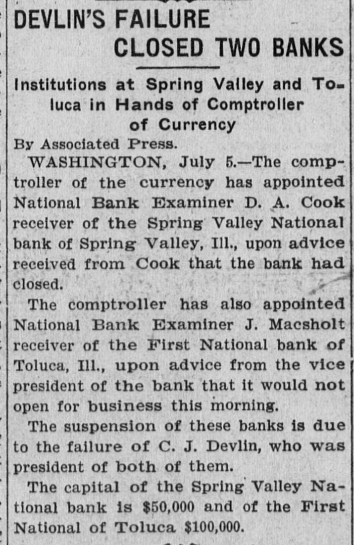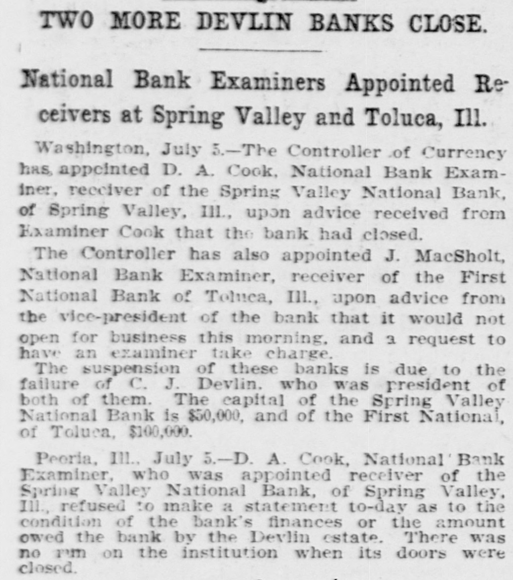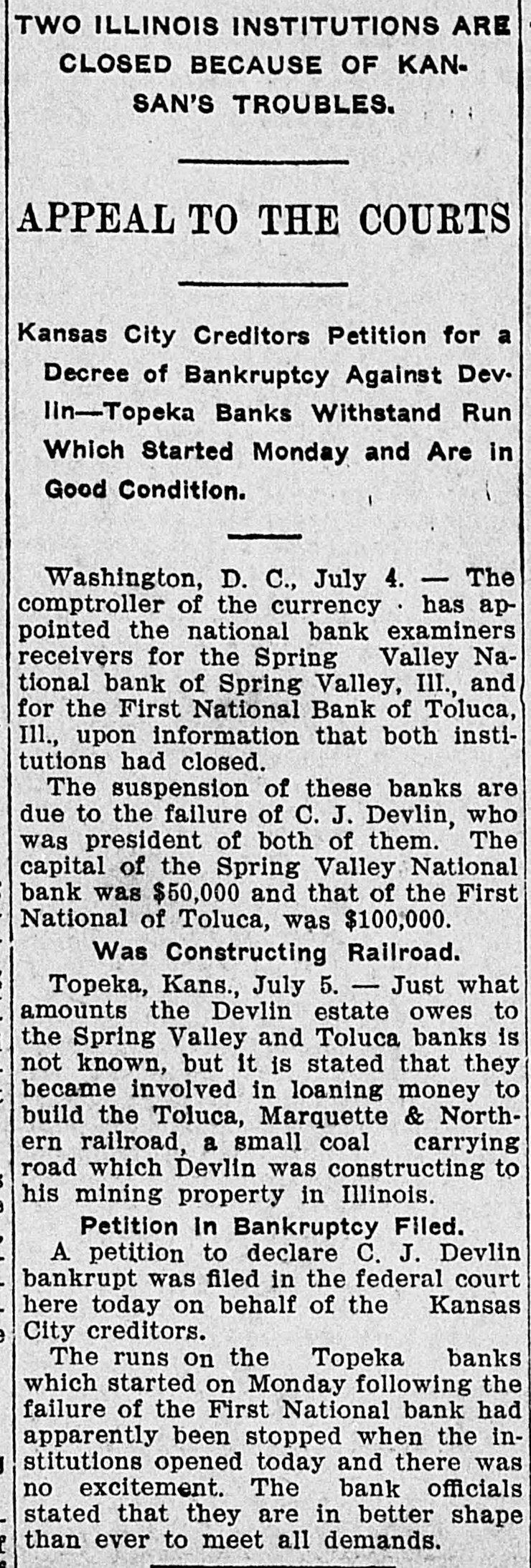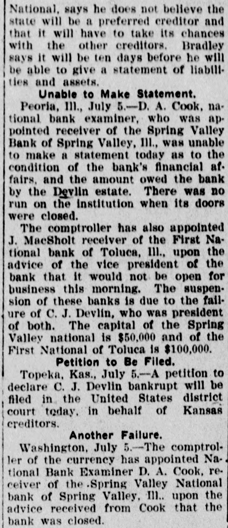 A roundhouse in the South Nashville, Tenn., yards of the Louisville & Nashville railroad was burned. Loss, $50,000. Nine locomotives were damaged to the extent of $1,000 each. C. J. Devlin filed in the United States district court at Topeka, Kan., an involuntary petition in bankruptcy. The petition schedules liabilities exceeding $2,600,000. James W. Alderdice, a lawyer convicted in New York of forgery, was sentenced to 18 years' imprisonment in Sing Sing. J. A. Spekenhier has been appointed receiver of the Commercial bank, of Hagerstown, Ind., on application of President Frank Mason. The liabilities exceed $100,000, while the assets are given as much less than that amount. Harry Walker, aged 18 years; and Alex. Worrall, aged 12, were dro wned in the Youghiagheny river near McKeesport, Pa. The seventh international conve ntion of the Epworth league was opened in Denver, Col. A tornado in Texas caused much loss of life and destruction of property in Montague county and the northern portion of the state. Twenty-four are known to be dead. The five-year-old son of Samuel Squillman, of Seymour, Ia., and the fouryear-old son of a neighbor, George Billard, were burned to death in a fire which destroyed Squillman's home. Herman Meminger, chief of the Milwaukee (Wis.) fire department, died from the effects of injuries sustained at a fire two months ago, when it was reported he inhaled acid fumes. Fred Ross, who was knocked out by Jack Donnelly in the sixteenth round of a prize fight at Aberdeen, Wash., is dead. His neck was dislocated and a blood clot gathered on the brain. Three railroad employes were killed and two injured and thousands of dollars' worth of property destroyed by a head-on collision on the Fitchburg division of the Boston & Maine railroad near Wachusett, Mass. Gen. Amasa Cobb, brigadier general of volunteers during the civil war, veteran of the Mexican war, congressman and ex-justice of the supreme court of Nebraska, died at Los Angeles, Cal, aged 82 years. The formal opening of the twenty-second International Christian Endeavor convention took place in Armory hall, Baltimore, Md., with about 8,000 delegates present. Mrs. Lucie B. Tyng, one of the bestknown temperance workers in the United States, died in Peoria, III. The new directory indicates Chicago's population to be 2,272.000. The weekly crop report shows that growth has been retarded by heavy rains, but the condition of corn in the corn belt is excellent. The money circulation July 1 was the largest per capita and in amount in the history of the country. Bank note issues in the past year were larger than the new gold increase. Most of the Chicago indicted packers, their agents and the companies in which they are interested have furnished bonds. Gov. Hanly's crusade against bookmakers has put an end to horse racing in Indiana. Samuel Thompson, a Chicago coffee importer, says the scheme of an eastern clique to have a tax imposed is a market manipulation to secure $12,000,000 profit on stock. Graeme Stewart's will, dividing an estate of $500,000 between his widow, children, brothers and sisters, was filed in Chicago. The Spring Valley (III.) national bank and the First national bank of Toluca, Ill., closed their doors as the result of the failure of C. J. Devlin, of Topeka, Kan. S. L. Frazer, of Chicago, when asked for an accounting by his partner in the brokerage business suddenly fled, leaving an alleged defalcation of $100,000. The Wabash Railway company has discharged its superintendent of the secret service department and 121 men employed in detective work. Fourth of July casualties reported throughout this country number 42 deaths and 2,431 injured. Loss of life variously estimated at more than 200 and less than 1,000 persons, and property damage to the extent of over $1,000,000 were caused by the recent flood which swept over the town of Guanajuaro, Mex. John Bowman, cashier of the Commercial bank of Hagerstown, Ind., committed suicide by shooting. No cause for the deed is known. Ten business houses and one dwelling at Roulette, Pa., were destroyed by fire. entailing-a loss of $50,000. The insurance was small. The American revivalists, Rev. Reuben A. Torrey and Charles M. Alexander, concluded their five months' revival campaign in England with a great thanksgiving service at Albert hall, London, for the 14,000 converts recorded. In view of the bad harvest prospects owing to the drought and the storms in Portugal, King Charles has sanctioned the importation of 75,000 tons of American wheat and has ordered the reduction of the customs duties by 50 per cent. The heat, which continued several days throughout central Europe, has caused, it is estimated from the reports now coming in, more than 100 deaths in Germany. At midday in the shade the temperature has been as