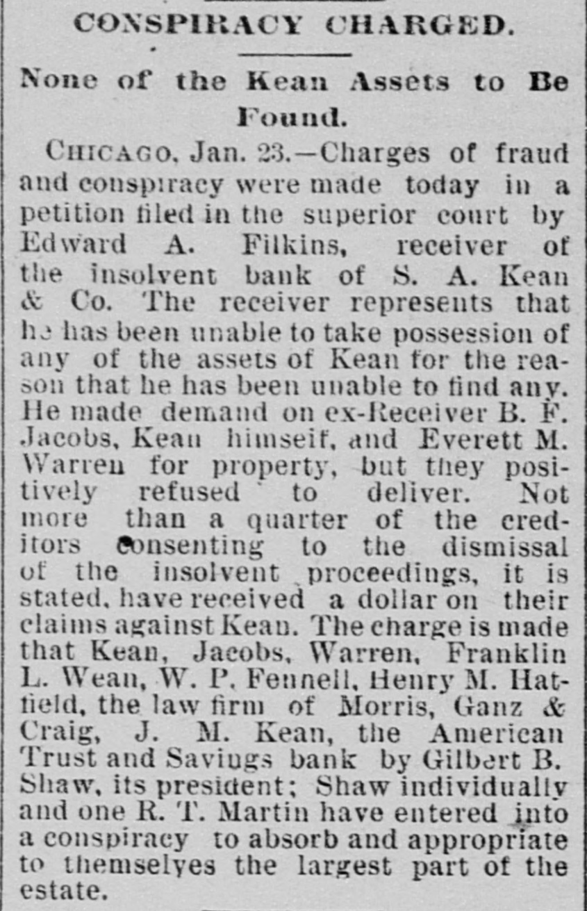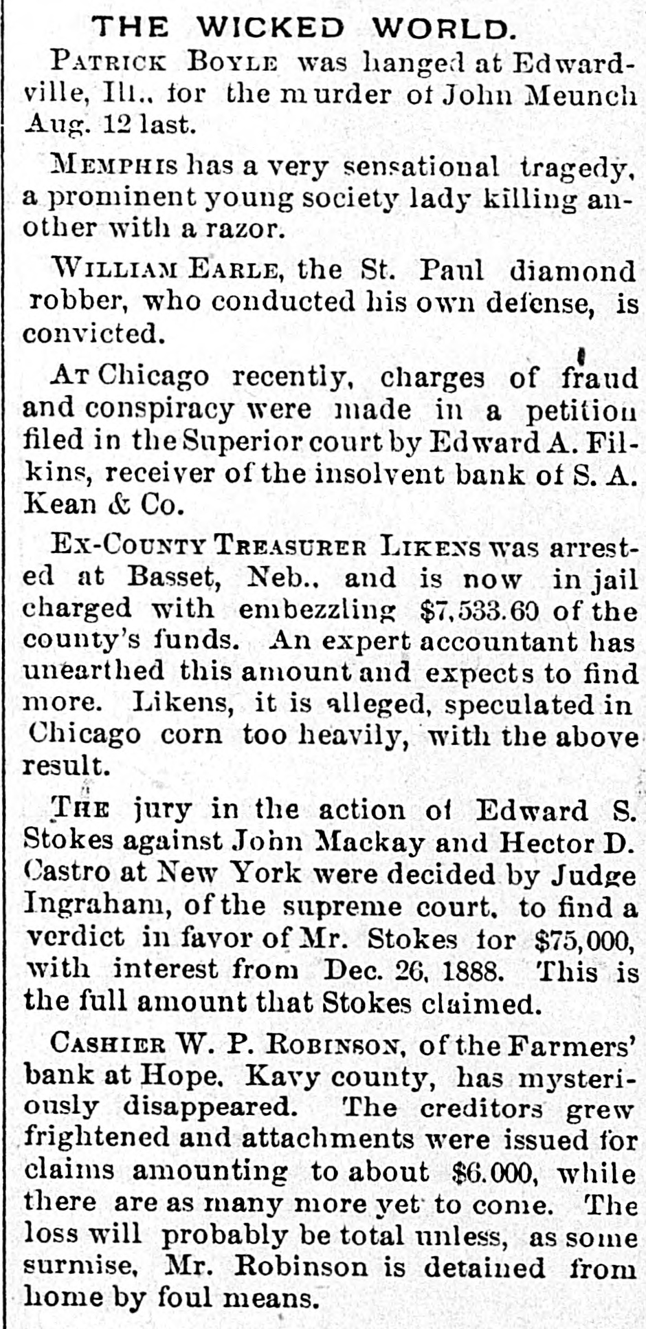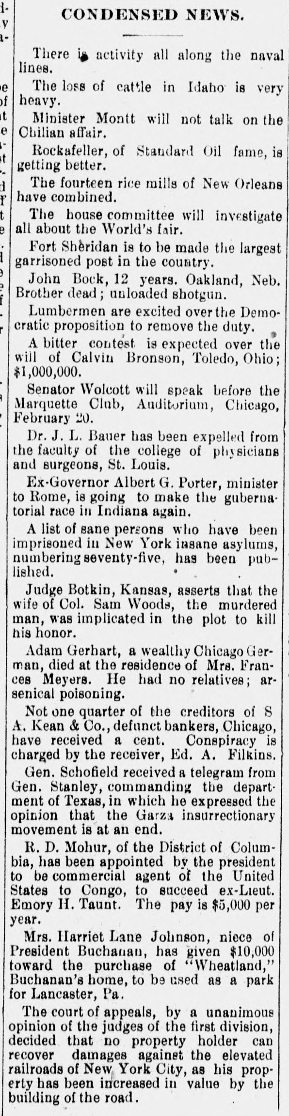1CONDENSED NEWS. y aThere is activity all along the naval lines. e The loss of cattle in Idaho is very of heavy. it Minister Montt will not talk on the e Chilian affair. Rockafeller, of Standard Oil fame, is t getting better. The fourteen rice mills of New Orleans d have combined. f t The house committee will investigate e all about the World's fair. Fort Sheridan is to be made the largest garrisoned post in the country. John Bock, 12 years. Oakland, Neb. Brother dead; unloaded shotgun. Lumbermen are excited over the Democratic proposition to remove the duty. A bitter contest is expected over the will of Calvin Bronson, Toledo, Ohio; $1,000,000. Senator Wolcott will speak before the Marquette Club, Auditorium, Chicago, February 20. Dr. J. L. Bauer has been expelled from the faculty of the college of physicians and surgeons, St. Louis. Ex-Governor Albert G. Porter, minister to Rome, is going to make the gubernatorial race in Indiana again. A list of sane persons who have been imprisoned in New York insane asylums, numbering seventy-five, has been published. Judge Botkin, Kansas, asserts that the wife of Col. Sam Woods, the murdered man, was implicated in the plot to kill his honor. Adam Gerhart, a wealthy Chicago German, died at the residence of Mrs. Frances Meyers. He had no relatives; arsenical poisoning. Not one quarter of the creditors of S A. Kean & Co., defunct bankers, Chicago, have received a cent. Conspiracy is charged by the receiver, Ed. A. Filkins. Gen. Schofield received a telegram from Gen. Stanley, commanding the department of Texas, in which he expressed the opinion that the Garza insurrectionary movement is at an end. R. D. Mohur, of the District of Columbia, has been appointed by the president to be commercial agent of the United States to Congo, to succeed ex-Lieut. Emory H. Taunt. The pay is $5,000 per year. Mrs. Harriet Lane Johnson, niece of President Buchanan, has given $10,000 toward the purchase of "Wheatland," Buchanan's home, to be used as a park for Lancaster, Pa. The court of appeals, by a unanimous opinion of the judges of the first division, decided that no property holder can recover damages against the elevated railroads of New York City, as his property has been increased in value by the building of the road.