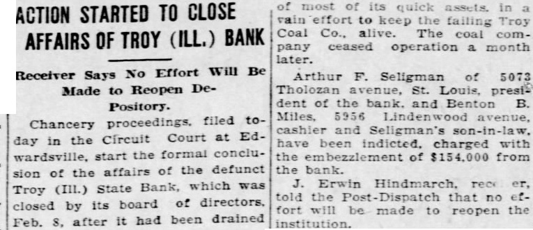 BANK CHECKED Cashier Miles Declares tors Will Not Lose; Assessment Against Stockholders Not Required. ASSETS" EN AS ONLY TROUBLE Bank Examiners Will Spend Week Making Check quested By Directors. Business of the Troy State Bank was suspended yesterday afternoon after the board of directors requested the office of State Auditor of Public Accounts Nelson to make an investigation and adjustment of the bank's affairs with possible liquidation of accounts. Benton Miles, cashier of the bank, declared today that bank will pay 100 percent without assessment stockholders loss to depositors. accounts on which the bank was unable to obtain quick collections, were today the "cause the trouble. Miles sonin-law of Seligman, president of the bank, declared today that there irregularities. Rodenberger and Seymour, state bank examiners, have charge of the bank's affairs at present. Mr. Rodenberger said today that about week vill be necessary complete the auditing of accounts, but that he believes uncollectable sets were the only cause of the present trouble. Mr. Miles said was simply other case of the city being too small banks. He declared support two that the Troy Exchange Bank some other bank, will probably take the assets of the bank. over The Troy State Bank was organizwith capital stock May 1319, The latest report shows of of $303,000. The total resources and accounts of desaving checking between and positors range $260,000 Seligman, clerk of the Troy mine when operated Brothers Coal Coke Comby Donk pany, has president of the bank its organization. He now since in the coal business St. engaged Louis and has resided there for the past years. Michael, formerly of the Telephone viceTroy of the bank. He recently president sold the phone exchange to Edwin Frey. of the John Feldmeier, president Troy Exchange Bank. declared today for transfer of that negotiations the assets have been made. Letter Betrays Him. St. Louis Feb. East illiterate negro from Davis, 22, asked two detectives Elerson, Ark., him letter from his to read for wife, Alberta. They read, "baby, can't sleep for dreaming of you. tell to come down here, would you baby. but the law laving for held him for Arkanwhereupon they sas authorities.