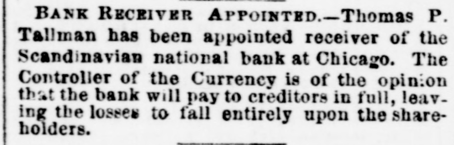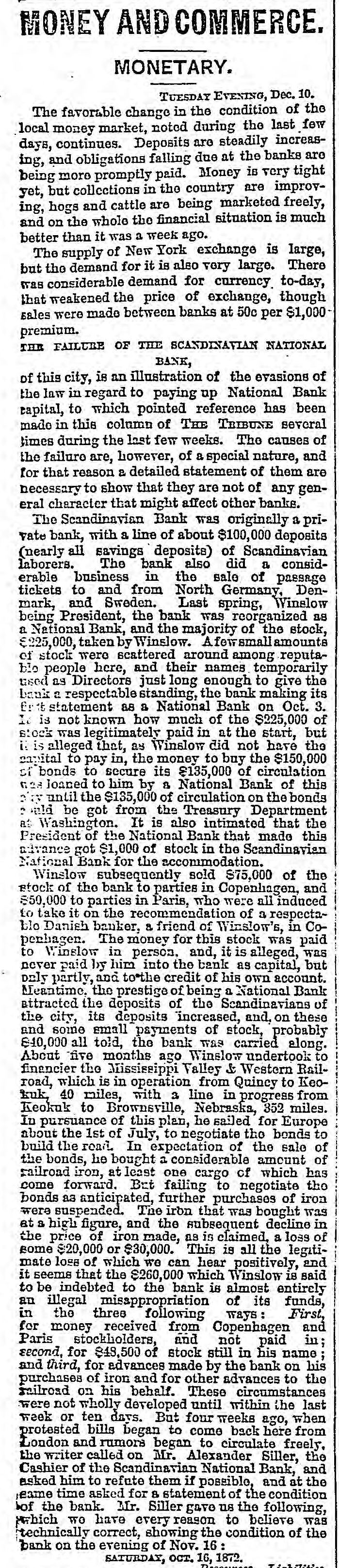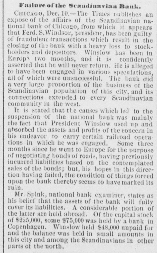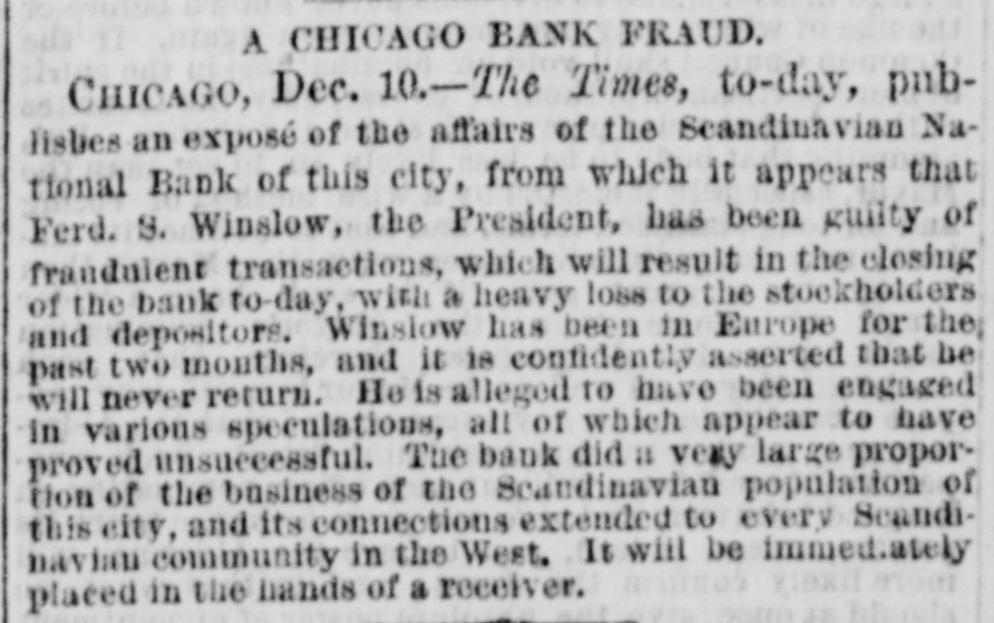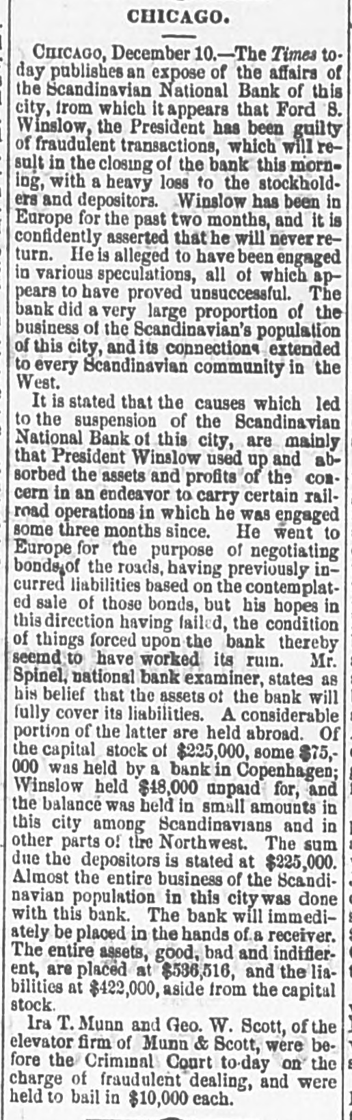 THE Scandinavian National Bank of Chicago has failed in consequence of frauds perpetrated by its President, Fred. S. Winslow.