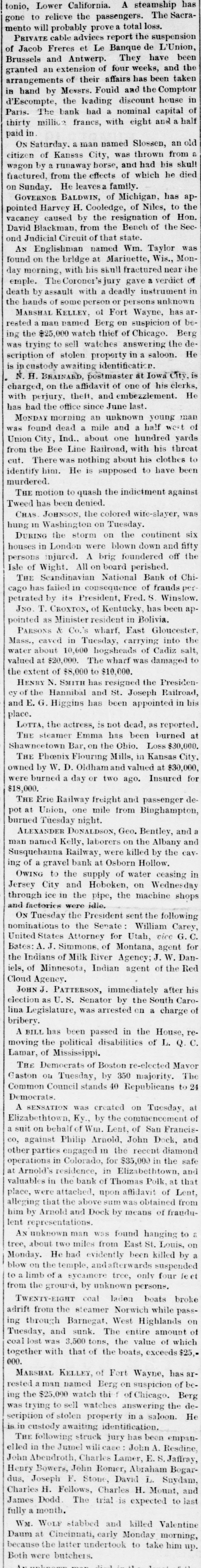 MARSHAL KELLEY, of Fort Wayne, has arrested a man named Berg on suspicion of being the $25,000 watch thief of Chicago. Berg was trying to sell watches answering the description of stolen property in a saloon. He is in custody awaiting identification.