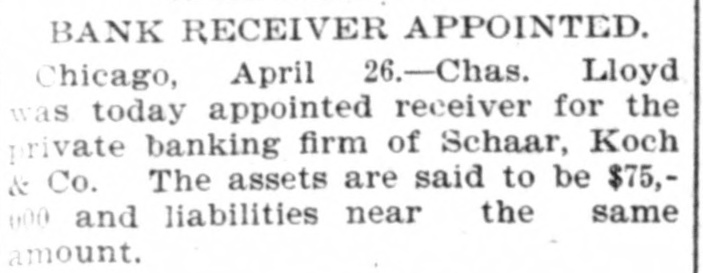 BANK RECEIVER APPOINTED. Chicago, April 26.-Chas. Lloyd was today appointed receiver for the private banking firm of Schaar, Koch & Co. The assets are said to be $75,000 and liabilities near the same amount.