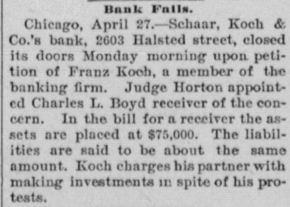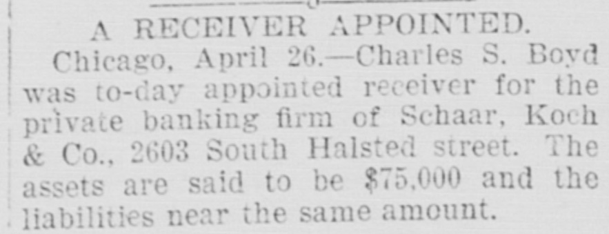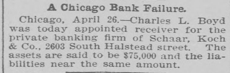 A Chicago Bank Failure. Chicago, April 26.-Charles L. Boyd was today appointed receiver for the private banking firm of Schaar, Koch & Co., 2603 South Halstead street. The assets are said to be $75,000 and the liabilities near the same amount.