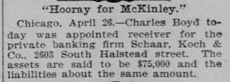"Hooray for McKinley." Chicago, April 26.-Charles Boyd today was appointed receiver for the private banking firm Schaar, Koch & Co., 2603 South Halstead street. The assets are said to be $75,000 and the liabilities about the same amount.
