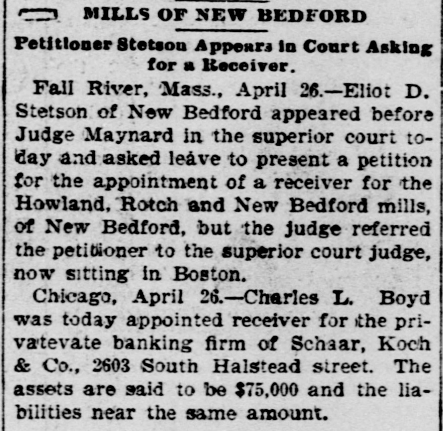 MILLS OF NEW BEDFORD Petitioner Stetson Appears in Court Asking for a Receiver. Fall River, Mass., April 26.-Eliot D. Stetson of New Bedford appeared before Judge Maynard in the superior court today and asked leáve to present a petition for the appointment of a receiver for the Howland, Rotch and New Bedford mills, of New Bedford, but the judge referred the petitioner to the superior court judge, now sitting in Boston. Chicago, April 26.-Charles L. Boyd was today appointed receiver for the privatevate banking firm of Schaar, Koch & Co., 2603 South Halstead street. The assets are said to be $75,000 and the liabilities near the same amount.