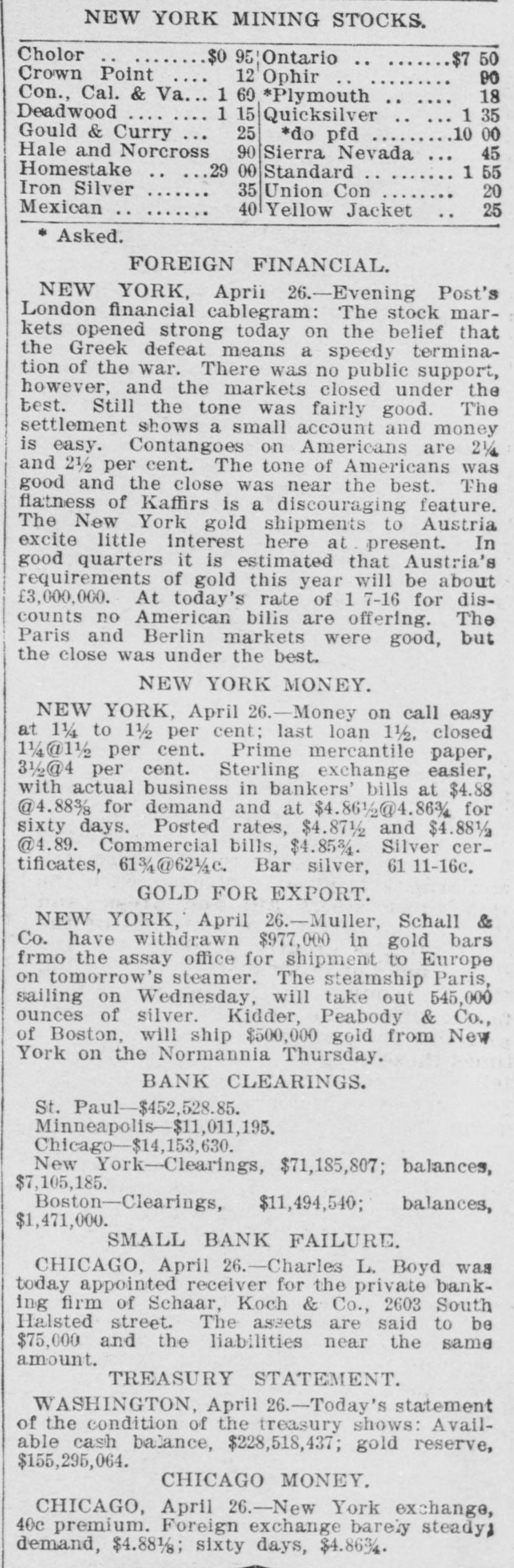 NEW YORK MINING STOCKS. Cholor $0 95 Ontario $7 50 Crown Point 90 12 Ophir Con., Cal. & Va 18 1 60 *Plymouth Deadwood 1 15 1 35 Quicksilver 25 10 00 Gould & Curry *do pfd Hale and Norcross 90 Sierra Nevada 45 Homestake 29 00 Standard 1 55 Iron Silver 35 Union Con 20 Mexican 40 Yellow Jacket 25 * Asked. FOREIGN FINANCIAL. NEW YORK, April 26.-Evening Post's London financial cablegram: The stock markets opened strong today on the belief that the Greek defeat means a speedy termination of the war. There was no public support, however, and the markets closed under the best. Still the tone was fairly good. The settlement shows a small account and money is easy. Contangoes on Americans are 2½ and 2½ per cent. The tone of Americans was good and the close was near the best. The flatness of Kaffirs is a discouraging feature. The New York gold shipments to Austria excite little interest here at present. In good quarters it is estimated that Austria's requirements of gold this year will be about £3,000,000. At today's rate of 1 7-16 for discounts no American bilis are offering. The Paris and Berlin markets were good, but the close was under the best. NEW YORK MONEY. NEW YORK, April 26.-Money on call easy at 1½ to 1½ per cent; last loan 1½, closed 1½@1½ per cent. Prime mercantile paper, 3½4 per cent. Sterling exchange easier, with actual business in bankers' bills at $4.88 @4.88% for demand and at $4.861/2@4.863 for sixty days. Posted rates, $4.87½ and $4.88½ @4.89. Commercial bills, $4.85%. Silver certificates, 61%@62½c. Bar silver, 61 11-16c. GOLD FOR EXPORT. NEW YORK, April 26.-Muller, Schall & Co. have withdrawn $977,000 in gold bars frmo the assay office for shipment to Europe on tomorrow's steamer. The steamship Paris, sailing on Wednesday, will take out 545,000 ounces of silver. Kidder, Peabody & Co., of Boston, will ship $500,000 gold from New York on the Normannia Thursday. BANK CLEARINGS. St. Paul-$452,528.85. Minneapolis-$11,011,195. Chicago-$14,153,630. New York-Clearings, $71,185,807; balances, $7,105,185. Boston-Clearings, $11,494,540; balances, $1,471,000. SMALL BANK FAILURE. CHICAGO, April 26.-Charles L. Boyd was today appointed receiver for the private banking firm of Schaar, Koch & Co., 2603 South Halsted street. The assets are said to be $75,000 and the liabilities near the same amount. TREASURY STATEMENT. WASHINGTON, April 26.-Today's statement of the condition of the treasury shows: Available cash balance, $228,518,437; gold reserve, $155,295,064. CHICAGO MONEY. CHICAGO, April 26.-New York exchange, 40c premium. Foreign exchange barely steady; demand, $4.881/8; sixty days, $4.863/4.