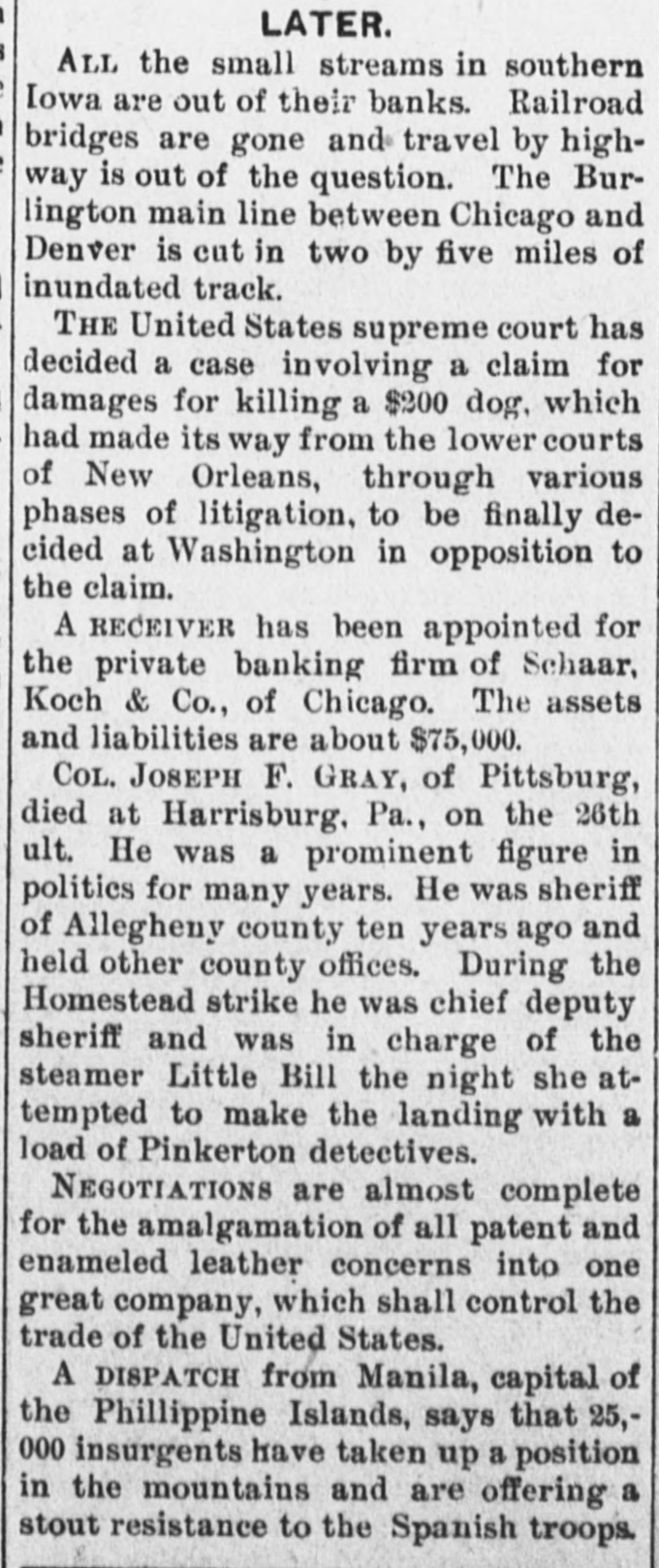 LATER. ALL the small streams in southern Iowa are out of their banks. Railroad bridges are gone and travel by highway is out of the question. The Burlington main line between Chicago and Denver is cut in two by five miles of inundated track. THE United States supreme court has decided a case involving a claim for damages for killing a $200 dog, which had made its way from the lower courts of New Orleans, through various phases of litigation, to be finally decided at Washington in opposition to the claim. A RECEIVER has been appointed for the private banking firm of Schaar, Koch & Co., of Chicago. The assets and liabilities are about $75,000. COL. JOSEPH F. GRAY, of Pittsburg, died at Harrisburg. Pa., on the 26th ult. He was a prominent figure in politics for many years. He was sheriff of Allegheny county ten years ago and held other county offices. During the Homestead strike he was chief deputy sheriff and was in charge of the steamer Little Bill the night she attempted to make the landing with a load of Pinkerton detectives. NEGOTIATIONS are almost complete for the amalgamation of all patent and enameled leather concerns into one great company, which shall control the trade of the United States. A DISPATCH from Manila, capital of the Phillippine Islands, says that 25,000 insurgents have taken up a position in the mountains and are offering a stout resistance to the Spanish troops.