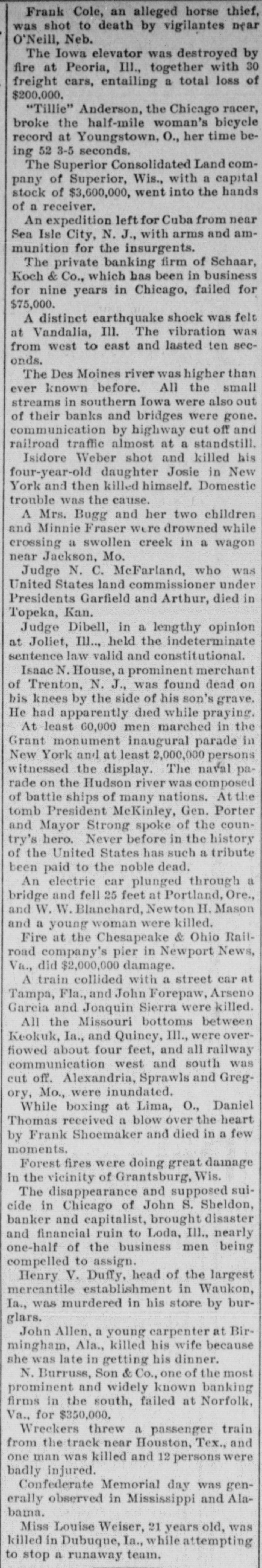 Frank Cole, an alleged horse thief, was shot to death by vigilantes near O'Neill, Neb. The Iowa elevator was destroyed by fire at Peoria, III., together with 30 freight cars, entailing a total loss of $200,000. "Tillie" Anderson, the Chicago racer, broke the half-mile woman's bicycle record at Youngstown, O., her time being 52 3-5 seconds. The Superior Consolidated Land company of Superior, Wis., with a capital stock of $3,600,000, went into the hands of a receiver. An expedition left for Cuba from near Sea Isle City, N. J., with arms and ammunition for the insurgents. The private banking firm of Schaar, Koch & Co., which has been in business for nine years in Chicago, failed for $75,000. A distinct earthquake shock was felt at Vandalia, III. The vibration was from west to east and lasted ten seconds. The Des Moines river was higher than ever known before. All the small streams in southern Iowa were also out of their banks and bridges were gone. communication by highway cut off and railroad traffic almost at a standstill. Isidore Weber shot and killed his four-year-old daughter Josie in New York and then killed himself. Domestic trouble was the cause. A Mrs. Bugg and her two children and Minnie Fraser were drowned while crossing a swollen creek in a wagon near Jackson, Mo. Judge N. C. McFarland, who was United States land commissioner under Presidents Garfield and Arthur, died in Topeka, Kan. Judge Dibell, in a lengthy opinion at Joliet, III.., held the indeterminate sentence law valid and constitutional. Isaac N. House, a prominent merchant of Trenton, N. J., was found dead on bis knees by the side of his son's grave. He had apparently died while praying. At least 60,000 men marched in the Grant monument inaugural parade in New York and at least 2,000,000 persons witnessed the display. The naval parade on the Hudson river was composed of battle ships of many nations. At the tomb President McKinley, Gen. Porter and Mayor Strong spoke of the country's hero. Never before in the history of the United States has such a tribute been paid to the noble dead. An electric car plunged through a bridge and fell 25 feet at Portland, Ore., and W. W. Blanchard, Newton H. Mason and a young woman were killed. Fire at the Chesapeake & Ohio Railroad company's pier in Newport News, Va., did $2,000,000 damage. A train collided with a street car at Tampa, Fla., and John Forepaw, Arseno Garcia and Joaquin Sierra were killed. All the Missouri bottoms between Keokuk, Ia., and Quincy, III., were overfiowed about four feet, and all railway communication west and south was cut off. Alexandria, Sprawls and Gregory, Mo., were inundated. While boxing at Lima, O., Daniel Thomas received a blow over the heart by Frank Shoemaker and died in a few moments. Forest fires were doing great damage in the vicinity of Grantsburg, Wis. The disappearance and supposed suicide in Chicago of John S. Sheldon, banker and capitalist, brought disaster and financial ruin to Loda, Ill., nearly one-half of the business men being compelled to assign. Henry V. Duffy, head of the largest mercantile establishment in Waukon, Ia., was murdered in his store by burglars. John Allen, a young carpenter at Birmingham, Ala., killed his wife because she was late in getting his dinner. N. Burruss, Son & Co., one of the most prominent and widely known banking firms in the south, failed at Norfolk, Va., for $350,000. Wreckers threw a passenger train from the track near Houston, Tex., and one man was killed and 12 persons were badly injured. Confederate Memorial day was generally observed in Mississippi and Alabama. Miss Louise Weiser, 21 years old, was killed in Dubuque, Ia., while attempting to stop a runaway team.