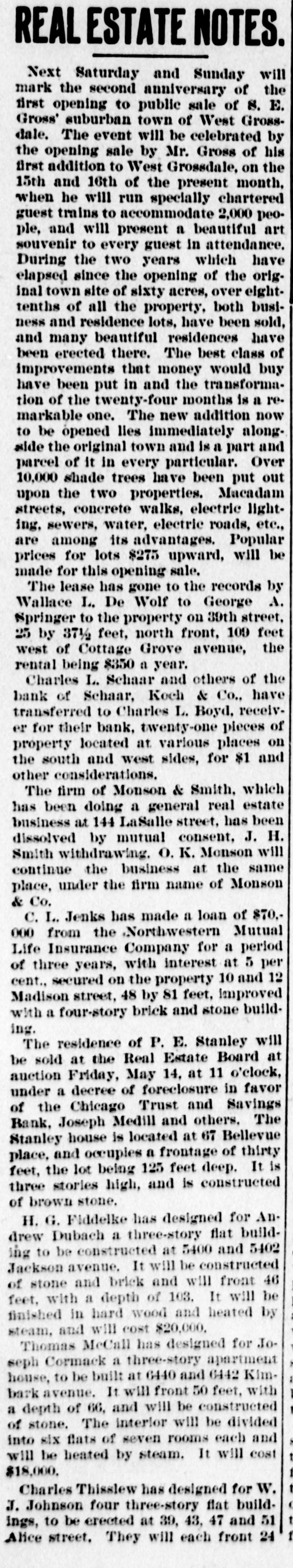 REAL ESTATE NOTES. Next Saturday and Sunday will mark the second anniversary of the first opening to public sale of S. E. Gross' suburban town of West Grossdale. The event will be celebrated by the opening sale by Mr. Gross of his first addition to West Grossdale, on the 15th and 16th of the present month, when he will run specially chartered guest trains to accommodate 2,000 people, and will present a beautiful art souvenir to every guest in attendance. During the two years which have elapsed since the opening of the original town site of sixty acres, over eighttenths of all the property, both business and residence lots, have been sold, and many beautiful residences have been erected there. The best class of improvements that money would buy have been put in and the transformation of the twenty-four months is a remarkable one. The new addition now to be opened lies immediately alongside the original town and is a part and parcel of it in every particular. Over 10,000 shade trees have been put out upon the two properties. Macadam streets, concrete walks, electric lighting, sewers, water, electric roads, etc., are among its advantages. Popular prices for lots $275 upward, will be made for this opening sale. The lease has gone to the records by Wallace L. De Wolf to George A. Springer to the property on 39th street, 25 by 37½ feet, north front, 109 feet west of Cottage Grove avenue, the rental being $350 a year. Charles L. Schaar and others of the bank of Schaar, Koch & Co., have transferred to Charles L. Boyd, receiver for their bank, twenty-one pieces of property located at various places on the south and west sides, for $1 and other considerations. The firm of Monson & Smith, which has been doing a general real estate business at 144 LaSalle street, has been dissolved by mutual consent, J. H. Smith withdrawing. O. K. Monson will continue the business at the same place, under the firm name of Monson & Co. C. L. Jenks has made a loan of $70.000 from the Northwestern Mutual Life Insurance Company for a period of three years, with interest at 5 per cent., secured on the property 10 and 12 Madison street, 48 by 81 feet, improved with a four-story brick and stone building. The residence of P. E. Stanley will be sold at the Real Estate Board at auction Friday, May 14, at 11 o'clock, under a decree of foreclosure in favor of the Chicago Trust and Savings Bank, Joseph Medill and others. The Stanley house is located at 67 Bellevue place, and occupies a frontage of thirty feet, the lot being 125 feet deep. It is three stories high, and is constructed of brown stone. H. G. Fiddelke has designed for Andrew Dubach a three-story flat building to be constructed at 5400 and 5402 Jackson avenue. It will be constructed of stone and brick and will front 46 feet, with a depth of 103. It will be finished in hard wood and heated by steam, and will cost $20,000. Thomas McCall has designed for Joseph Cormack a three-story apartment house, to be built at 6440 and 6442 Kimbark avenue. It will front 50 feet, with I a depth of 66, and will be constructed of stone. The interior will be divided into six flats of seven rooms each and will be heated by steam. It will cost 1 $18,000. 1 1 Charles Thisslew has designed for W. € J. Johnson four three-story flat build1 ings, to be crected at 39, 43, 47 and 51 1 Alice street, They will each front 24