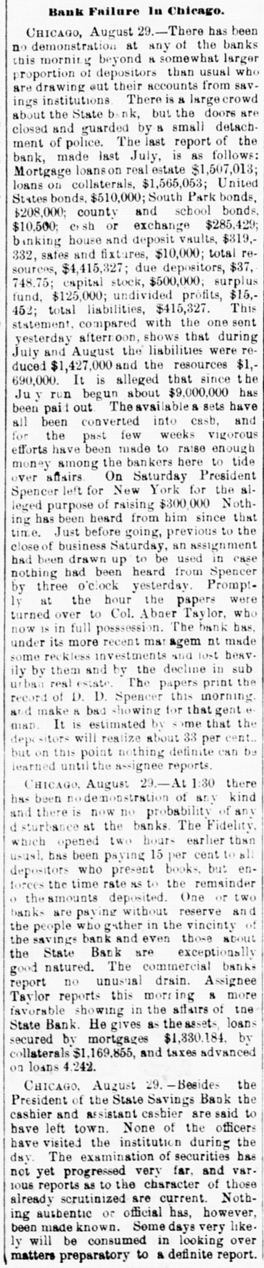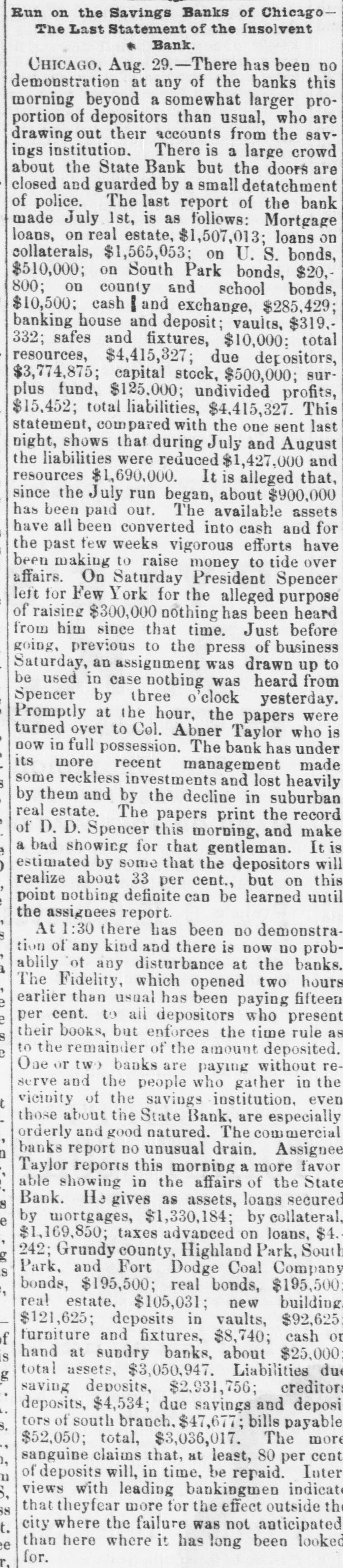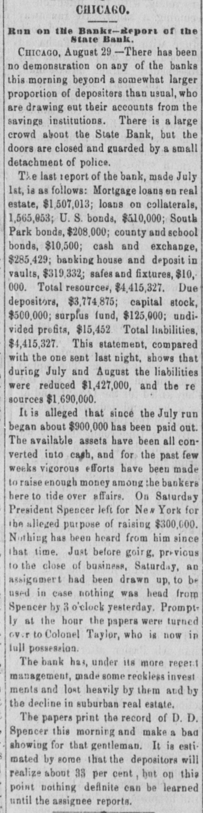 Run on the Savings Banks of Chicago The Last Statement of the Insolvent Bank. CHICAGO, Aug. 29.-There has been no demonstration at any of the banks this morning beyond a somewhat larger proportion of depositors than usual, who are drawing out their accounts from the savings institution. There is a large crowd about the State Bank but the doors are closed and guarded by a small detatchment of police. The last report of the bank made July 1st, is as follows: Mortgage loans, on real estate, $1,507,013; loans on collaterals, $1,565,053; on U. S. bonds, $510,000; on South Park bonds, $20, 800; on county and school bonds, $10,500; cash I and exchange, $285,429; banking house and deposit; vaults, $319. 332; safes and fixtures, $10,000: total resources, $4,415,327 due depositors, $3,774,875; capital stock, $500,000; sur plus fund, $125.000; undivided profits, $15,452; total liabilities, $4,415,327. This statement, compared with the one sent last night, shows that during July and August the liabilities were reduced $1,427,000 and resources $1,690,000. It is alleged that, since the July run began, about $900,000 has been paid out. The available assets have all been converted into cash and for the past few weeks vigorous efforts have been making to raise money to tide over affairs. On Saturday President Spencer left for Few York for the alleged purpose of raising $300,000 nothing has been heard from him since that time. Just before going, previous to the press of business Saturday, an assignment was drawn up to be used in case nothing was heard from Spencer by three o'clock yesterday. Promptly at the hour, the papers were turned over to Col. Abner Taylor who is now in full possession. The bank has under its more recent management made some reckless investments and lost heavily by them and by the decline in suburban real estate. The papers print the record of D. D. Spencer this morning, and make is a bad showing for that gentleman. It estimated by some that the depositors will realize about 33 per cent., but on this point nothing definite can be learned until the assignees report. At 1:30 there has been DO demonstration of any kind and there is now no probablily of any disturbance at the banks. The Fidelity, which opened two hours earlier than usual has been paying fifteen per cent. to all depositors who present their books, but enforces the time rule as to the remainder of the amount deposited One or two banks are paying without reserve and the people who gather in the vicioity of the savings institution. even those about the State Bank, are especially orderly and good natured. The commercial banks report no unusual drain. Assignee Taylor reports this morning a more favor able showing in the affairs of the State Bank. He gives as assets, loans secured 8 by wortgages, $1,330,184; by collateral, $1,169,850; taxes advanced on loans, $4. 242; Grundy county, Highland Park, South Park, and Fort Dodge Coal Company bonds, $195,500; real bonds, $195,500 real estate, $105,031; new building $121,625; deposits in vaults, $92,625 f furniture and fixtures, $8,740; cash or is hand at sundry banks, about $25,000 total assets, $3,050,947. Liabilities du g saving deposits, $2,931,756; creditor deposits, $4,534; due savings and deposi tors of south branch, $47,677 bills payable S. $52,050; total, $3,036,017. The more sanguine claims that, at least, 80 per cent , n of deposits will, in time, be repaid. Inter views with leading bankingmen indicate S. that theyfear more for the effect outside th 88 t. city where the failure was not anticipated ee than here where it has long been looked for.