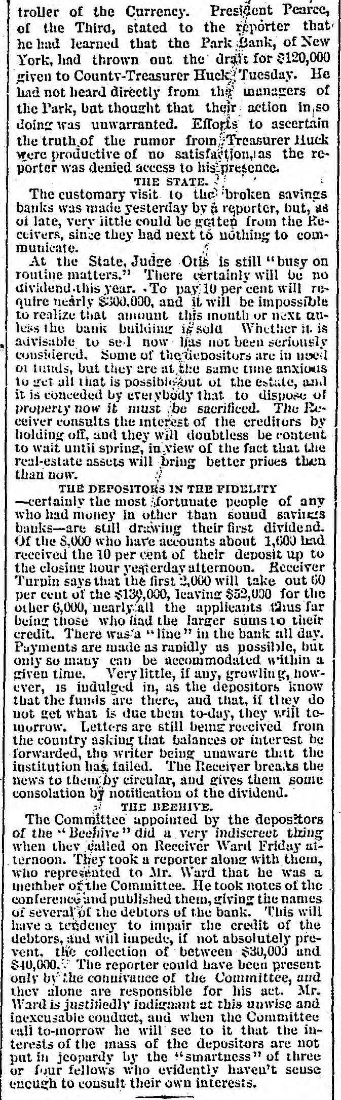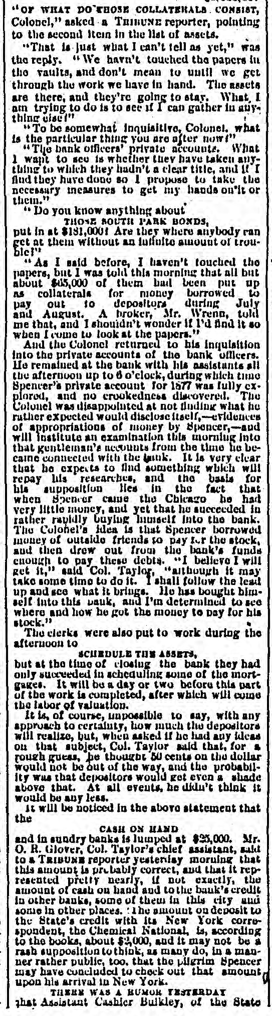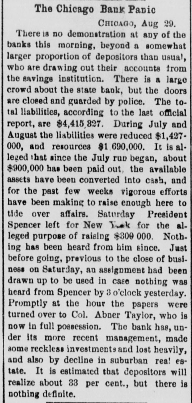 Run on the Savings Banks of Chicago The Last Statement of the Insolvent Bank. CHICAGO, Aug. 29.-There has been no demonstration at any of the banks this morning beyond a somewhat larger proportion of depositors than usual, who are drawing out their accounts from the savings institution. There is a large crowd about the State Bank but the doors are closed and guarded by a small detatchment of police. The last report of the bank made July 1st, is as follows: Mortgage loans, on real estate, $1,507,013; loans on collaterals, $1,565,053; on U. S. bonds, $510,000; on South Park bonds, $20, 800; on county and school bonds, $10,500; cash I and exchange, $285,429; banking house and deposit; vaults, $319. 332; safes and fixtures, $10,000: total resources, $4,415,327 due depositors, $3,774,875; capital stock, $500,000; sur plus fund, $125.000; undivided profits, $15,452; total liabilities, $4,415,327. This statement, compared with the one sent last night, shows that during July and August the liabilities were reduced $1,427,000 and resources $1,690,000. It is alleged that, since the July run began, about $900,000 has been paid out. The available assets have all been converted into cash and for the past few weeks vigorous efforts have been making to raise money to tide over affairs. On Saturday President Spencer left for Few York for the alleged purpose of raising $300,000 nothing has been heard from him since that time. Just before going, previous to the press of business Saturday, an assignment was drawn up to be used in case nothing was heard from Spencer by three o'clock yesterday. Promptly at the hour, the papers were turned over to Col. Abner Taylor who is now in full possession. The bank has under its more recent management made some reckless investments and lost heavily by them and by the decline in suburban real estate. The papers print the record of D. D. Spencer this morning, and make is a bad showing for that gentleman. It estimated by some that the depositors will realize about 33 per cent., but on this point nothing definite can be learned until the assignees report. At 1:30 there has been DO demonstration of any kind and there is now no probablily of any disturbance at the banks. The Fidelity, which opened two hours earlier than usual has been paying fifteen per cent. to all depositors who present their books, but enforces the time rule as to the remainder of the amount deposited One or two banks are paying without reserve and the people who gather in the vicioity of the savings institution. even those about the State Bank, are especially orderly and good natured. The commercial banks report no unusual drain. Assignee Taylor reports this morning a more favor able showing in the affairs of the State Bank. He gives as assets, loans secured 8 by wortgages, $1,330,184; by collateral, $1,169,850; taxes advanced on loans, $4. 242; Grundy county, Highland Park, South Park, and Fort Dodge Coal Company bonds, $195,500; real bonds, $195,500 real estate, $105,031; new building $121,625; deposits in vaults, $92,625 f furniture and fixtures, $8,740; cash or is hand at sundry banks, about $25,000 total assets, $3,050,947. Liabilities du g saving deposits, $2,931,756; creditor deposits, $4,534; due savings and deposi tors of south branch, $47,677 bills payable S. $52,050; total, $3,036,017. The more sanguine claims that, at least, 80 per cent , n of deposits will, in time, be repaid. Inter views with leading bankingmen indicate S. that theyfear more for the effect outside th 88 t. city where the failure was not anticipated ee than here where it has long been looked for.