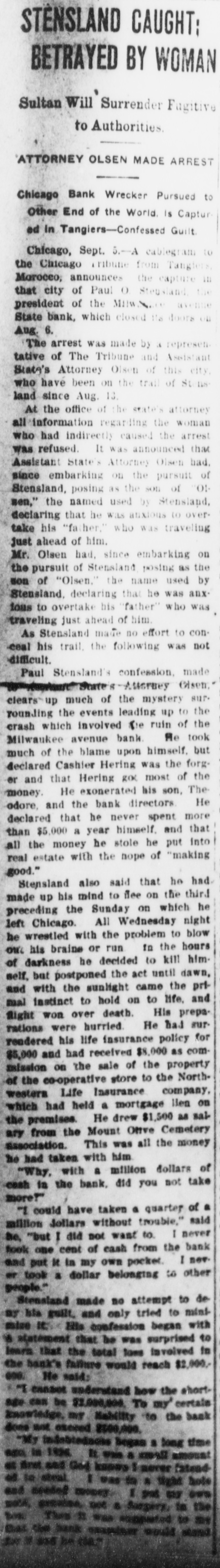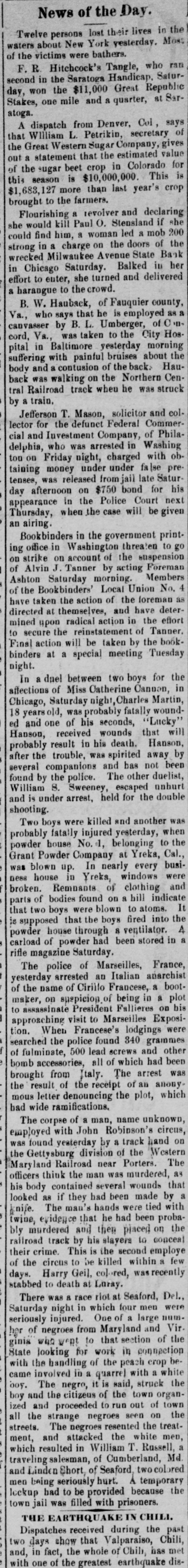 News of the Day. their Twelve persons New York lost yearerday. about bathers. waters victims were Tangle, who Satursecond of the Hitchcock's Handie Republic $11,000 one F. R. in the Saratoga Great BarStakes, day, won the mile and a quarter, Col, Sugar atoga. A William dispatch L. from Petrikincompany Denver, secretary estimated out a crop that the Great Western that the Colorado for this more of the season statement ugar beet is $10,000,000. than last in year's This $1,683,127 to the farmers. and declaring if brought Flourishing kill a Paul revolvestensland o. led a mob of the wrecked she would find him, a woman on the doors State Bank in Chicago Saturday. strong could in ilwaukee charge Avenue Balked in her and she turned delivered effort to enter, to the crowd. a harangue W. Hauback, he of Fauquier Remployed county, of who says B.L. City canvasser Va., B. by was that taken Umberger, yesterday to the morning the cord, pital Va. in with Baltimore painful of bruises the back> about Hau- Censuffering contusion Northern tral Railroad body back and was a walking track on when the he by train. and col golicitor lector Jefferson for Investment the T. defunct Mason, Company, Federal in Washing of Commer- Phila cial and was arrested with obdelphia, night, under false pre Friday money who charged jail too on under late Satur- his taining released from for tenses, was on $750 bond Court next Thursday, an airing. day appeaday, appearance afternoon when in the the Police will be given print Bookbindewashington in the government on threaten suspension office in account the Foreman ing on strike on Tanner by acting Members of Alvin Union of the deterAshton Bookbinders Saturday J. morning Local loreman a No. of the the action and have the effort directed have taken at themselvection radical in of Tanner mined upon the reinstatement taken by the Tuesday book to secure action will be meeting binders Final at a special the for boys Chicago, night. In a duel Miss between Oatherine two Canoon, Martin in night, fatally received 18 affections yearsold, Saturday of was his probably seconds, Charles that "Lucky" wound- will ed and one of wounds Hanson, Hanson, in his death. away by result was spirited been several companions The police. after probably the trouble, and has other not duelist, anhurt escaped by the double found William under 8. arrest, Sweeney, held for the shooting. and is Two boys were injured killed and yesterday, another to the probably fatally No. 1, belonging at Yreka, Cal., In powder house Company nearly every busi- were Grant was blown Powder up. in Yreka, of windows clothing indicate and Dess house Rembants on a hill parts broken. of bodies were found blown fired to atoms. into the that two boys the boys ventilator. powder is supposed house powder that through had 8 been stored in carload magazine of Saturday. France, Marseilles, rifle The police of an Italian anarchisi a bootmaker, arrested of Cirillo Francese, in plot bis of yesterday the name on suppicion. of being Fallieres Exposi were to lodgings of lead all of tion. to approaching When the police visit Francese's found screws 340 and grammes had other been searched bomb fulmingter accessories, 500 Italy. The which of arrest an anony was which brought from the receipt plot, mous wide lettermifications. name the result of denouncing the unknown, bad man, circus, The corpse with of John Robinson's track hand on employed found yeaterday division by a of the Western The near that the was Gettysburg Railroad man was Porters. murdered, Maryla think the several wounds by officers body contained had been made tied with his looked as if they hands were proba the knife. evidence that then placed twine, murdered The man's and he glayers had been to employe conceal on bly track by his the second railroad is within their crime. This to be killed was recently the circus Geil, col- red, of Harry at Laray. stabbed days. to death race riot at Seaford, men Del. There was 8 in which four a large seriously from of Saturday injured. night One Maryland section and Vir the her who went in looking of the with the State ginia of negroes handling for to work that peach connection crop with the involved in quarrel said, struck organcame The negro, it of the town of town 009. and the citizeus to run seen out on the ized and strange negroes the all The the ment, in resulted boy the proceeded negroes resented white Russell, treatof streets. and attacked William T. Md. Cumberland, and seriously which traveling galesman of Seaford, two colored temporary Icekup Linder Short, hurt. because the was filled jail town men being bad to be provided with prisoners. IN THE CHILI. the EARTHQUAKEING Chili, Dispatches received that Valparaiso, Chili, has one show of disof and, two days in fact, the greatest whole earthquake the