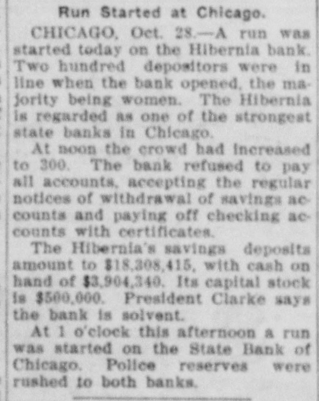 Run Started at Chicago. CHICAGO, Oct. 28.-A run was started today on the Hibernia bank. Two hundred depositors were in line when the bank opened, the majority being women. The Hibernia is regarded as one of the strongest state banks in Chicago. At noon the crowd had Increased to 300. The bank refused to pay all accounts, accepting the regular notices of withdrawal of savings accounts and paying off checking accounts with certificates. The Hibernia's savings deposits amount to $18,308,415, with cash on hand of $3,904,340. Its capital stock is $500,000. President Clarke says the bank is solvent. At 1 o'clock this afternoon a run was started on the State Bank of Chicago. Police reserves were rushed to both banks.