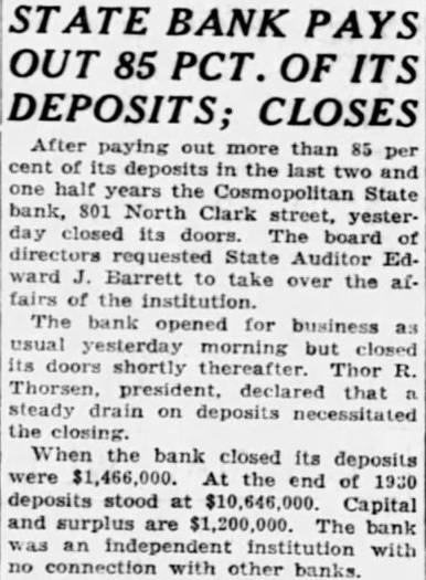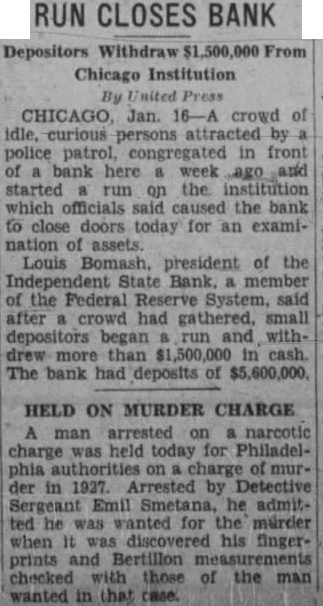 RUN CLOSES BANK Depositors Withdraw Chicago Institution By CHICAGO, Jan. crowd idle, curious persons attracted police patrol, congregated in bank here week started run on the institution which officials the bank close doors today for an examination Louis Bomash, president of the State Bank. the Federal System, said after crowd had gathered, run withthan The bank had deposits of HELD ON MURDER CHARGE A man narcotic was held today for on by Detective he admitted he wanted the his fingerprints Bertillon checked wanted