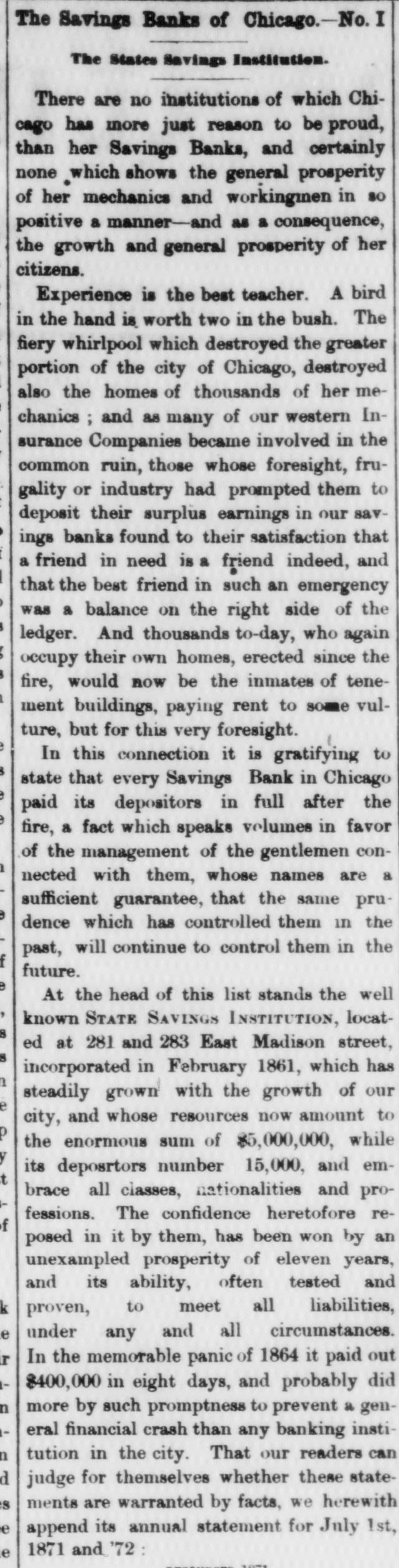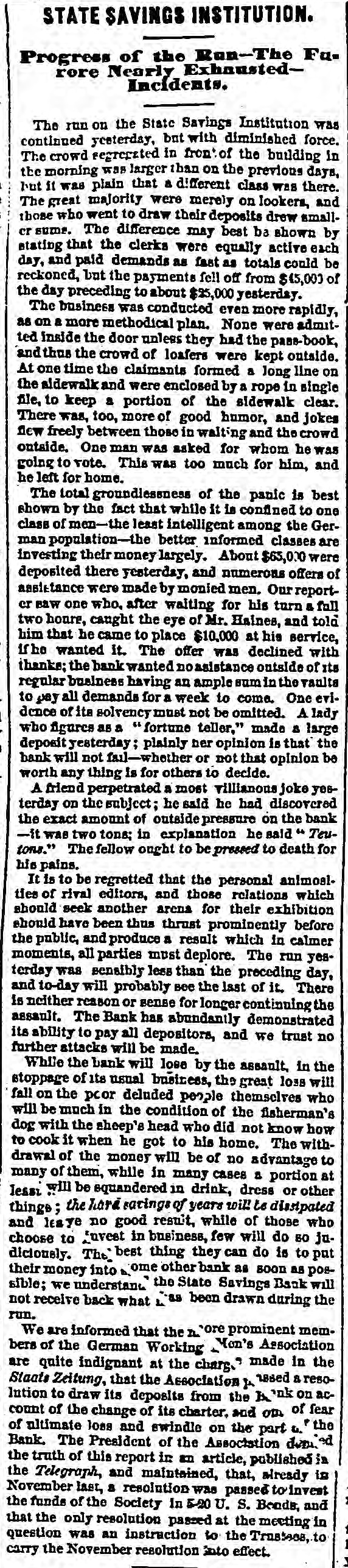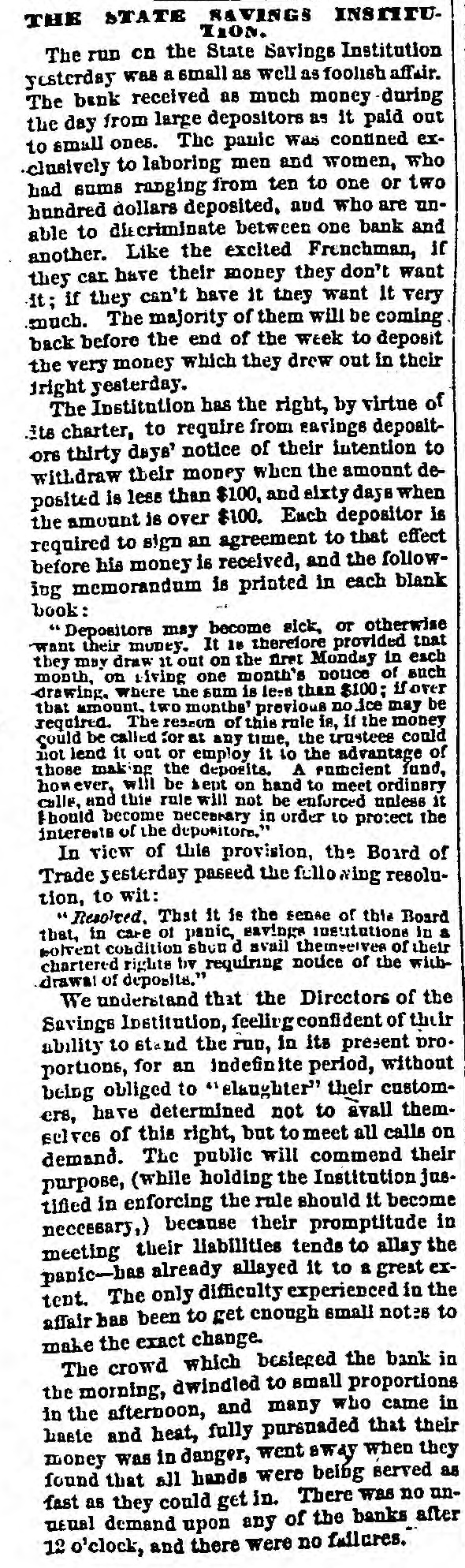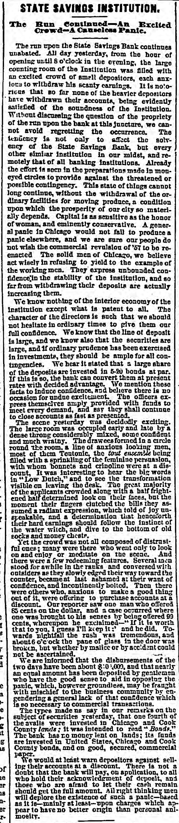 STATE SAVINGS INSTITUTION. The Run Continued-An Excited Crowd-A Causeless Panic. The run upon the State Savings Bank continues unabated. All day yesterday, from the hour of opening until 8 o'clock in the evening, the large counting room of the Institution was filled with an excited crowd of small depositors, each anxlors to withdraw his scanty earnings. It Is notorious that BO far none of the heavier depositors have withdrawn their accounts, being evidently satisfied of the soundness of the Institution. Without discussing the question of the propriety of the run upon the bank at this juncture, we cannot avoid regretting the occurrence. The tendency is not only to affect the solvency of the State Savings Bank, but every other similar institution in our midst, and remotely that of all banking institutions. Already the effort 1a seen in the preparations made in moneyed circles to provide against the threatened or possible contingency. This state of things cannot long continue, without the withdrawal of the ordinary facilities for moving produce, a condition upon which the prosperity of our city so materially depends. Capital is as sensitive as the honor of woman, and eminently conservative. A general panic in Chicago would not fall to produce a panic elsewhere, and we are sure our people do not wish the commercial revulsion of 57 to be roenacted The solid men of Chicago, we believe act wisely in refusing to yield to the example of the working mcn. They express unbounded confidence'in the stability of the institution, and 60 far from withdrawing their deposits are actually increasing them. We know nothing of the interior economy of the Institution except what is patent to all. The character of the directors is such that we should not hesitate in ordinary times to give them our full confidence. We know that the line of deposit is large, and we know also that the securities are large, and If ordinary prudence has been exercised in investments, they should be ample for all contingencies. We hear it stated that a large share of the deposits are invested in 5-20 bonds at par. If this is so, the bank can convert them at present rates with decided advantage. We mention these facts to induce confidence, and believe there is no occasion for undue excitement. The officers express themselves amply provided with funds to meet every demand, and esy they shall continue to close accounts as fast as presented. The scene yesterday was decidedly exciting. The large room was occupled early and late by a dense throng considerably mixed, some confident and much wratny. The drawees formed in a circle round the room. a line of anxious looking men, most of them Toutonic, the tout ensemble being filled with a sprinkling of the feminino persuasion, with whom bonnets and crinoline were at a discount, It was interesting to hear the big words in Low Dutch," and to see the transformation visible on leaving the desk. The great majority of the applicants crowded along with a half frightened half determined look on their faces, but the moment their fingers clutched the bills they assumed a radiant expression, which told of joy unspeakable, and a determination that henceforth their hard earnings should follow the instinct of the water witch, and dive to the bottom of old socks and money chests. Yet the crowd was not all composed of distrustful ones; many were there who went only to look on and enjoy or meditate on the scene. And there were a few redeeming features. Several men stood for awhile in the ranks and conversed with outsiders as they slowly edged their way toward the counter, becament last ashamed at their want of confidence, and incontinently bolted. Then there were others who, anxious to make a good thing out of it, were offering to purchase accounts at a discount. Our reporter saw one man who offered 85 cents on the dollar, and 1 case occurred where one was brought to his senses by being offered 99 cents, whereupon he exclaimed-" If it is worth that to you. I guess rn keep it:' and he did. Towards nightfall the rush was tremendous, and about6 'c'ock the pane of glass in the door was broken, but whether by malice or by accident could not be ascertained. We are informed that the disbursements of the two days have been about $101,000, and that nearly an equal amount has been deposited by gentlemen who have the good sense to aid in opposing the panic, which, however groundless, may be fraught with mischief to the business community by engendering a general lack of that confidence which is 80 necessary to commercial transactions. e The types made us say in our remarks on the subject of securities yesterday, that one fourth of the avails were invested in Chicago and Cook County lands : It was intended to read Bonds." it The bank has DO money lent on lands; its funds be are invested in United States, Chicago and Cook is County bonds, and on good, secured, commercial paper. We would at least warn depositors against selling their accounts at a discount. There is not a of doubt that the bank will pay, on application, to all 10 who hold their acknowledgment of deposit, and er those who are afraid to let their cash remain should get the full amount. All right thinking men 18 will deplore the existence of such a panic-based as it is-mainly at least-upon charges which apar pear to have no better origin than personal anl-