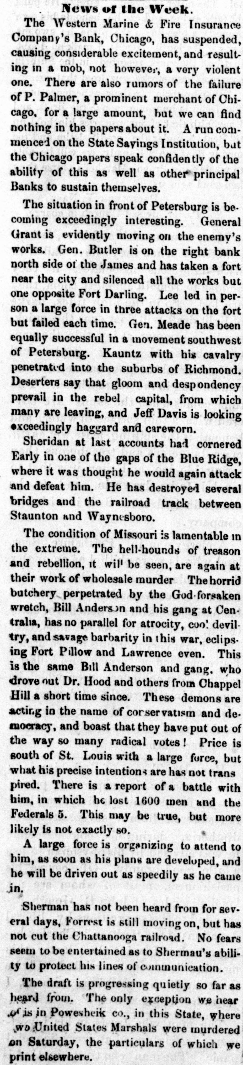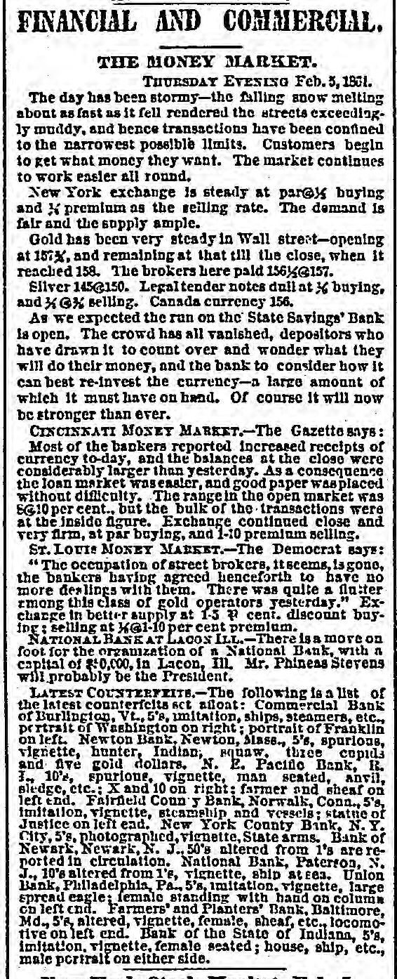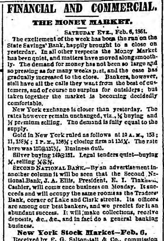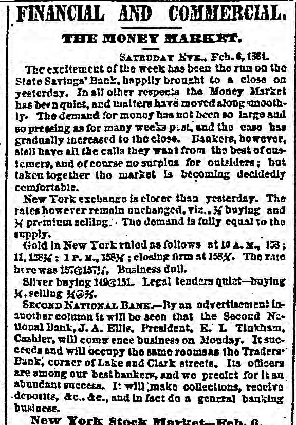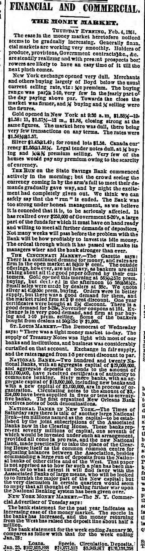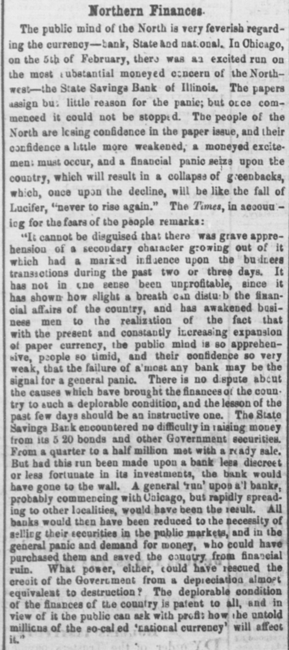 STATE SAVINGS INSTITUTION. The Run Continued-An Excited Crowd-A Causeless Panic. The run upon the State Savings Bank continues unabated. All day yesterday, from the hour of opening until 8 o'clock in the evening, the large counting room of the Institution was filled with an excited crowd of small depositors, each anxlors to withdraw his scanty earnings. It Is notorious that BO far none of the heavier depositors have withdrawn their accounts, being evidently satisfied of the soundness of the Institution. Without discussing the question of the propriety of the run upon the bank at this juncture, we cannot avoid regretting the occurrence. The tendency is not only to affect the solvency of the State Savings Bank, but every other similar institution in our midst, and remotely that of all banking institutions. Already the effort 1a seen in the preparations made in moneyed circles to provide against the threatened or possible contingency. This state of things cannot long continue, without the withdrawal of the ordinary facilities for moving produce, a condition upon which the prosperity of our city so materially depends. Capital is as sensitive as the honor of woman, and eminently conservative. A general panic in Chicago would not fall to produce a panic elsewhere, and we are sure our people do not wish the commercial revulsion of 57 to be roenacted The solid men of Chicago, we believe act wisely in refusing to yield to the example of the working mcn. They express unbounded confidence'in the stability of the institution, and 60 far from withdrawing their deposits are actually increasing them. We know nothing of the interior economy of the Institution except what is patent to all. The character of the directors is such that we should not hesitate in ordinary times to give them our full confidence. We know that the line of deposit is large, and we know also that the securities are large, and If ordinary prudence has been exercised in investments, they should be ample for all contingencies. We hear it stated that a large share of the deposits are invested in 5-20 bonds at par. If this is so, the bank can convert them at present rates with decided advantage. We mention these facts to induce confidence, and believe there is no occasion for undue excitement. The officers express themselves amply provided with funds to meet every demand, and esy they shall continue to close accounts as fast as presented. The scene yesterday was decidedly exciting. The large room was occupled early and late by a dense throng considerably mixed, some confident and much wratny. The drawees formed in a circle round the room. a line of anxious looking men, most of them Toutonic, the tout ensemble being filled with a sprinkling of the feminino persuasion, with whom bonnets and crinoline were at a discount, It was interesting to hear the big words in Low Dutch," and to see the transformation visible on leaving the desk. The great majority of the applicants crowded along with a half frightened half determined look on their faces, but the moment their fingers clutched the bills they assumed a radiant expression, which told of joy unspeakable, and a determination that henceforth their hard earnings should follow the instinct of the water witch, and dive to the bottom of old socks and money chests. Yet the crowd was not all composed of distrustful ones; many were there who went only to look on and enjoy or meditate on the scene. And there were a few redeeming features. Several men stood for awhile in the ranks and conversed with outsiders as they slowly edged their way toward the counter, becament last ashamed at their want of confidence, and incontinently bolted. Then there were others who, anxious to make a good thing out of it, were offering to purchase accounts at a discount. Our reporter saw one man who offered 85 cents on the dollar, and 1 case occurred where one was brought to his senses by being offered 99 cents, whereupon he exclaimed-" If it is worth that to you. I guess rn keep it:' and he did. Towards nightfall the rush was tremendous, and about6 'c'ock the pane of glass in the door was broken, but whether by malice or by accident could not be ascertained. We are informed that the disbursements of the two days have been about $101,000, and that nearly an equal amount has been deposited by gentlemen who have the good sense to aid in opposing the panic, which, however groundless, may be fraught with mischief to the business community by engendering a general lack of that confidence which is 80 necessary to commercial transactions. e The types made us say in our remarks on the subject of securities yesterday, that one fourth of the avails were invested in Chicago and Cook County lands : It was intended to read Bonds." it The bank has DO money lent on lands; its funds be are invested in United States, Chicago and Cook is County bonds, and on good, secured, commercial paper. We would at least warn depositors against selling their accounts at a discount. There is not a of doubt that the bank will pay, on application, to all 10 who hold their acknowledgment of deposit, and er those who are afraid to let their cash remain should get the full amount. All right thinking men 18 will deplore the existence of such a panic-based as it is-mainly at least-upon charges which apar pear to have no better origin than personal anl-