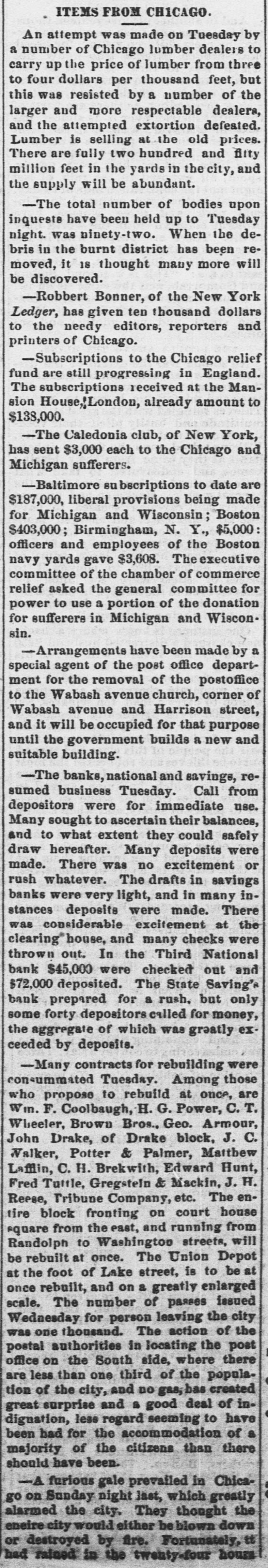 ITEMS FROM CHICAGO. An attempt was made on Tuesday by a number of Chicago lumber dealers to carry up the price of lumber from three to four dollars per thousand feet, but this was resisted by a number of the and more and larger the attempted respectable extortion defeated. dealera, Lumber is selling at the old prices. There are fully two hundred and fitty million feet in the yards in the city, and the supply will be abundant. -The total number of bodies upon inquests have been held up to Tuesday was ninety-two. denight. in the district When has been the bris burnt removed, it 18 thought many more will be discovered. -Robbert Bonner, of the New York Ledger, has given ten thousand dollars to the needy editors, reporters and printers of Chicago. -Subscriptions to the Chicago relief fund are still progressing in England. The subscriptions received at the Mansion House,London, already amount to $138,000. -The Caledonia club, of New York, has sent $3,000 each to the Chicago and Michigan sufferers. -Baltimore su bscriptions to date are $187,000, liberal provisions being made for Michigan and Wisconsin; Boston $403,000; Birmingham, N. Y., $5,000: officers and employees of the Boston navy yards gave $3,608. The executive committee of the chamber of commerce relief asked the general committee for power to use a portion of the donation for sufferers in Michigan and Wisconsin. -Arrangements have been made by a special agent of the post office department for the removal of the postoffice to the Wabash avenue church, corner of avenue street, and it will be purpose Wabash occupied and builds Harrison for that and until the government a new suitable building. -The banks, national and savings, resumed business Tuesday. Call from depositors were for immediate use. Many sought to ascertain their balances, and to what extent they could safely draw hereafter. Many deposits were made. There was no excitement or rush whatever. The drafts in savings banks were very light, and in many instances deposits were made. There was considerable excitement at the clearing" house, and many checks were thrown out. In the Third National bank $45,000 were checked out and $72,000 deposited. The State Saving's bank prepared for a rush, but only some forty depositors called for money, the aggregate of which was greatly exceeded by deposits. -Many contracts for rebuilding were consummated Tuesday. Among those who propose to rebuild at once, are Win. F. Coolbaugh, H. G. Power, C.T. Wheeler, Brown Bros., Geo. Armour, John Drake, of Drake block, J. C. Potter & Palmer, Matthew C. H. Brekwith, Lafflin, Walker, Edward Hunt, & Tribune Company, Reese, Fred Tuttle, Gregstein Mackin, etc. The J.H. enon house from the east, and tire quare block fronting running court streets, from will to Washington at once. The be Randolph rebuilt Union to Depot be at at the foot of Lake street, is once rebuilt, and on a greatly enlarged scale. The number of passes issued Wednesday for person leaving the city was one thousand. The action of the postal authorities in locating the post office on the South side, where there are than one third less gas, bas of the popula- created tion of the city, and DO and a good great surprise seeming deal to of have indignation, less regard been had for the accommodation of a majority of the citizens than there should have been. -A furious gale prevailed in Chicalast, the They alarmed go on Sunday city. night which thought greatly down the eneire city would either be blown or destroyed by fire. Fortunately, # had rained in the twenty.four hours