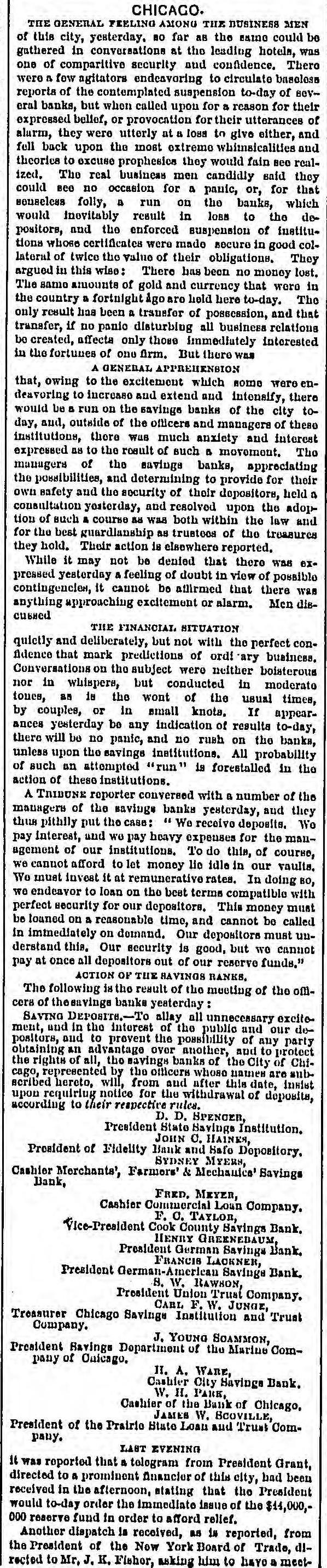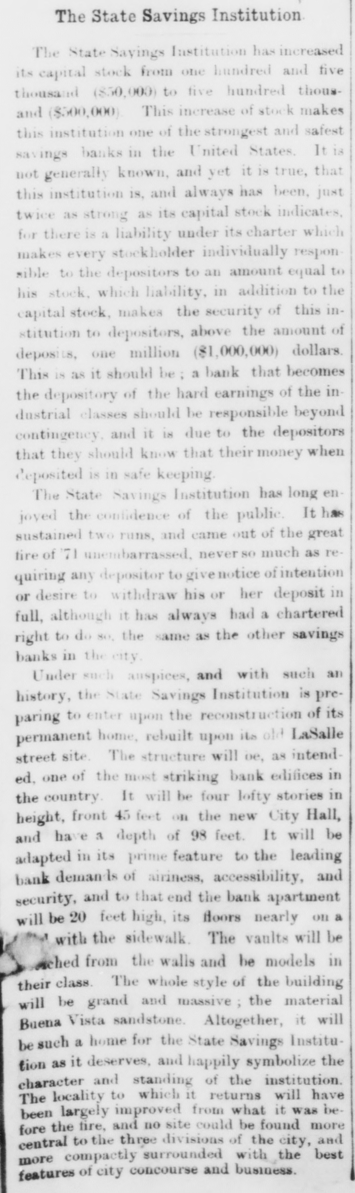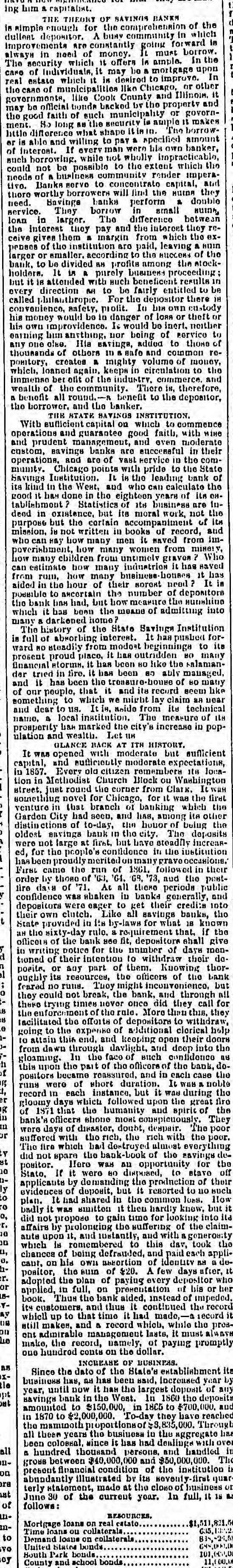 oners 16 ample. In the care of Individuals, it may be a mortgage upon real estate which it in desired to improve. In the case of municipalities like Chicago, or other governments, like Cook County and Illinois. it may be official bonds backed by the property and the good faith of such municipality or government. No long BB the security is suiple It makes bittle difference what shape It in in. The borrowor is able and willing to pay a specified amount of interest. If every man were his own banker, such borrowing. while not wholly impracticable, could not be possible to the extent which the needs of a business community render Imperative. Banks serve to concentrate capital, and there worthy borrowers will find the MUIDA they need. Bavings banks perform a double service. They borrow in small loan in larger. The difference between summ, the interest they pay and the interest they receive gives them a margin from which the expenses of the institution are paid, leaving a Burn larger or smaller. according to the of the bank, to be divided RH profits among the stockholders. It in a purely business proceeding but it IR attended with much beneficent results in every direction MA to be fairly entitled to be called philanthropic. For the depositor there IH convenience. his safety, profit. In bin own custody money would be in danger of loss or theft his own improvidence. It would be inert. neither or earning hun anything, nor being of pervice to any one o!Ho. His savings, added to thome of thousands of others ID a safe and common pointory, creates a mighty volume of money, rewhich, loaned again, keeps in circulation to the immenso ber offt of the industry. commerce. and wealth of the community. There in, therefore, a benefit all round.-s benefit to the depositor, the borrower. and the banker. THE STATE SAVINGS INSTITUTION. With sufficient capital on which to operations and guarantee good faith, commence with and prudent management, and even moderate wine custom, savings banks are successful in their operations. and are of vast service in the munity. Chicago points with pride to the State comSavings its Institution. It in the leading bank of kind in the West, and who Can calculate the good it has done in the eighteen years of its deed tablishmont ? Statistics of Its business are CH. Inin existence, but its moral work, not the purpose but the cortain accompaniment of Itm mission, 18 not written in books of record, and who can Hay how many men it saved from impoverishment, how how many women from missly, many children from untimely graves ? Who can from estimate how many industries it has Haved run, how many business houses it has aided in the hour of their sorost need ? It is possible to ascertain the number of depositors the bank bas had, but how measure the Hunshing which it has been the means of admitting into many a darkened home The history of the State Savings Institution is full of absorbing interest. It has pushed forward NO steadily from modost beginnings to its present proud place, it has outridden 80 many financial storms, it has been HO like the salamander tried in fire, it has been 80 ably managed, and it has been the treasure-bouse of 80 many of our people, that it and its record seem like something to which we might lay claim BA near and dear to us. It is, Moide from its technical name, a local institution. The measure of ILH prosperity bar marked the city's increase in population and wealth. Let 11H GLANCE BACK AT ITH HISTORY. It was opened with moderate but sufficient capital, in and sufficiently modorate expectations, 1857. Every old citizen remembers 118 location in Methodist Church Block on Washington street. just round the corner from Clark, It something novel for Chicago, for It was the first Was venture in that branch of banking which the Garden City had seen, and has, among its other distinctions of to-day, the houor of bulug the oldest savings bank in the city, The deposits were not large at first, but have steadily increased, for the people's confidence in the institution proudly meritedonmany graveoccasions. First came the run of 1861. followed in their order by those of 63, G4. GR, '73, aud the posttire days of 71. At all LLIORO periods public confidence was shaken in banks generally, and depositors were eager to ket their credits into their own clutch. Like all savings banks, the State provided in Its by-laws for what 18 known an the sixty-day rule, a requirement that, if the officers of the bank 860 fit, depositors shall give in writing potice for the uninber of days IDODtioned of their intention to withdraw their deposits. or any part of them. Knowing thoroughly its resources, the officers of the bank feared no runs. Tuoy might inconvenience, but they could not break, the bank, and through all there trying times never once did they call for the enforement of the rule. More than this, they lacilitated the efforts of depositors to withdraw, going to the expense of additional clorical to attain this end, and keeping open their doors help from dawn through davlight, and deep into the gloaming. In the face of such confidence this upon the part of the officers of the bank, as positors became reassured. and in each case the doruns were of short duration. It WAS a noble record in each instance, but it was during the gloomy days which followed upon the great fire 111 of 1871 that the humanity and spiric of the in bank's officers shone most conspicuously. They ware days of disaster, doubt, despair. The suffered with the rich, the rich with the poor The fire which had destroyed almost everything poor. st did not spare the bank-book of the savings de10 positor. Here WILH an opportunity for the State, If it were 80 disposed, to stavo off y applicants by demanding the production of their 0 evidences of deposit, but It resorted to no such 0 plan. It had shared in the common lobs. How badly it was smitton it then hardly know, but it r. did not propose to gain time for looking into its 10