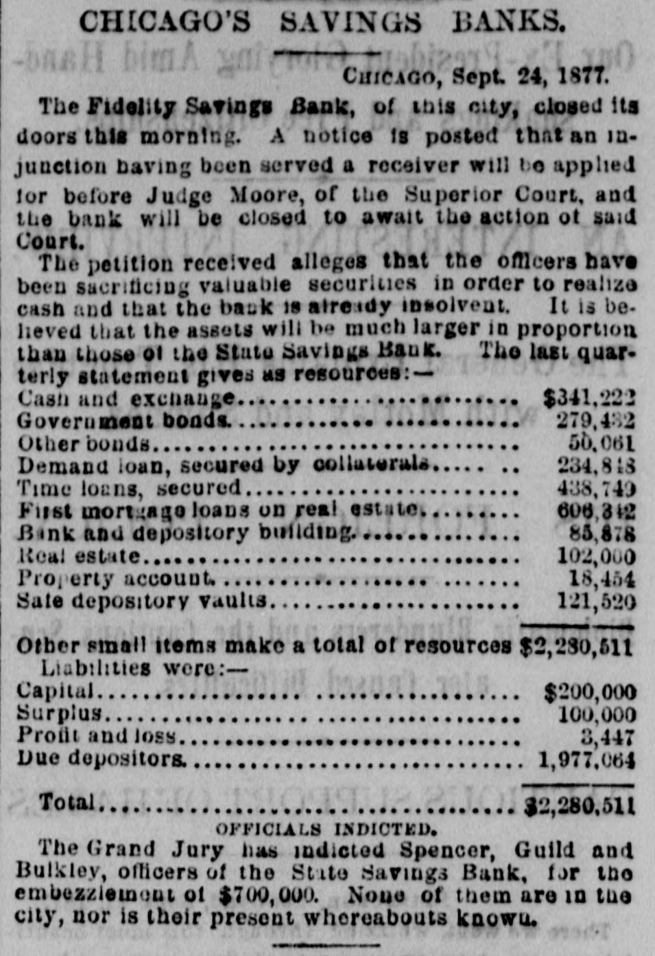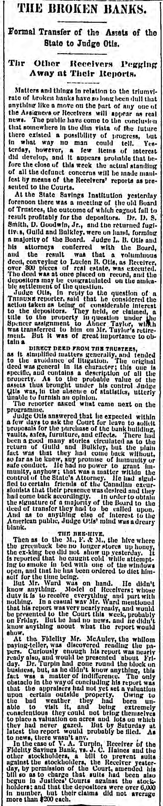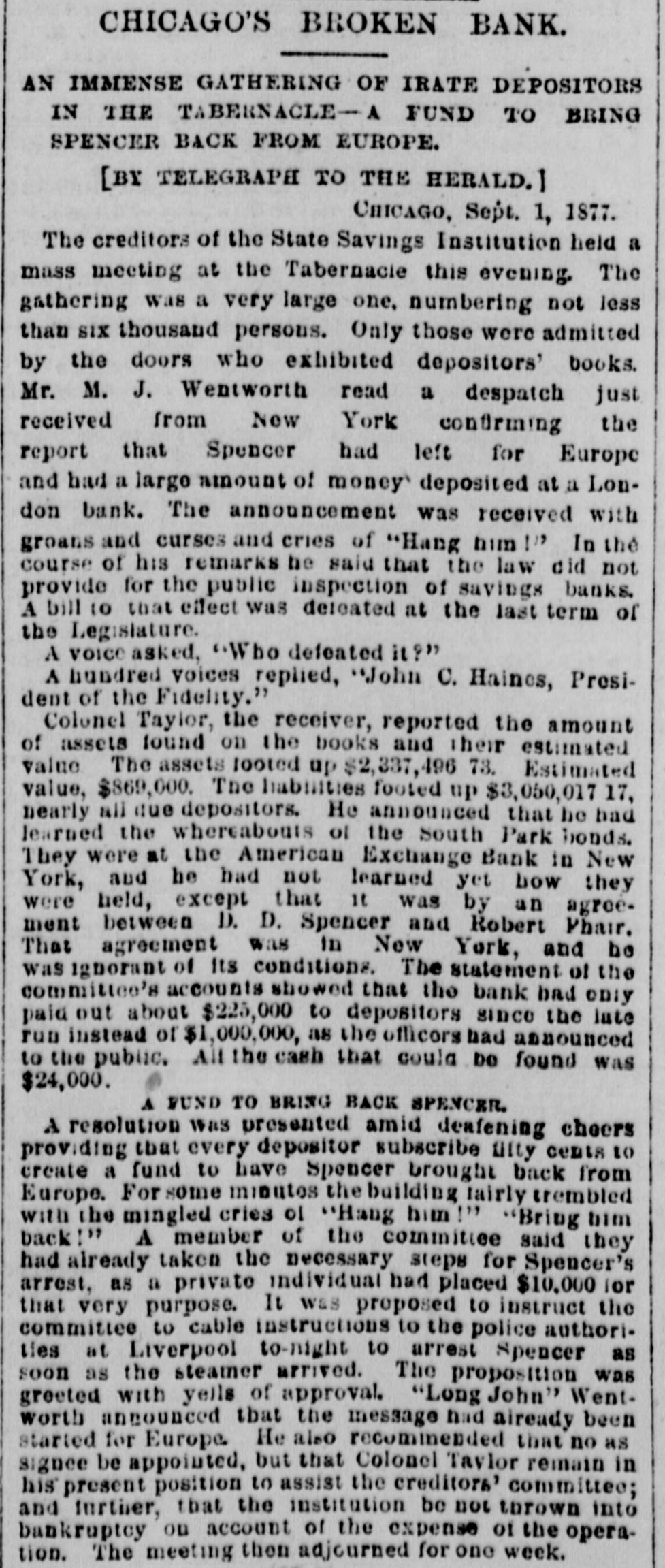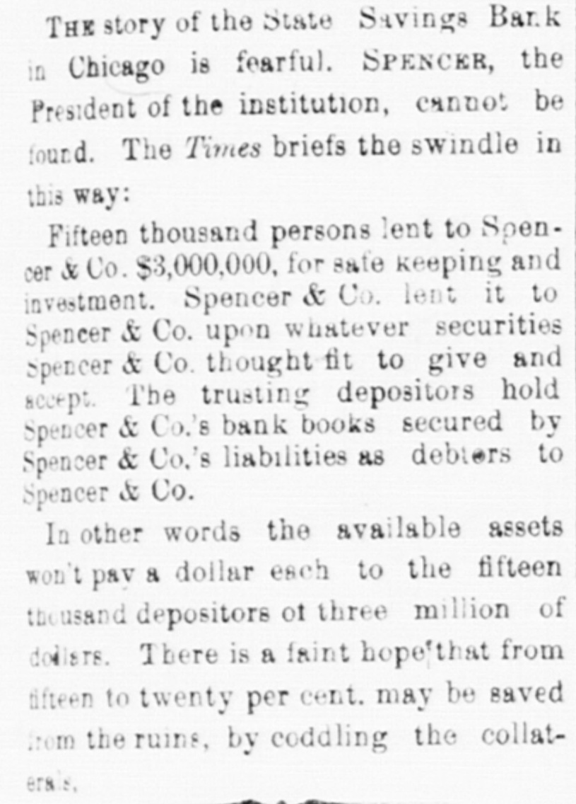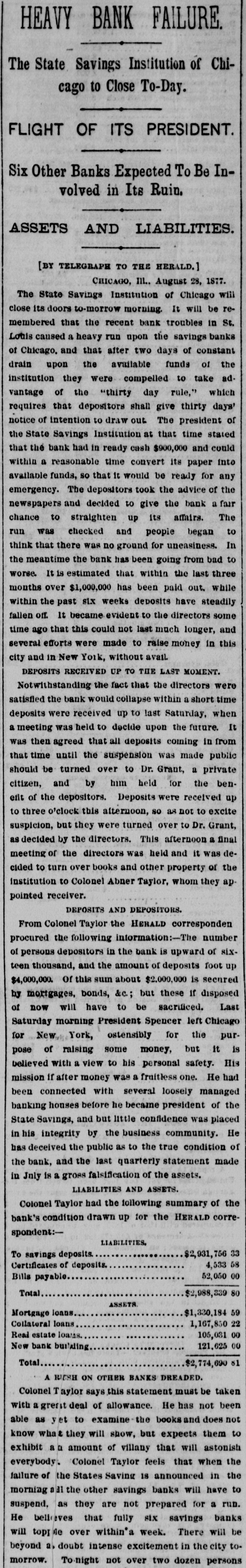 signally defeated. Though sadly crippled since the fire, it was hoped by the management that the Institution would worry through, but the series of sudden failures in St. Louis brought a run upon the quivering bank, which, in an effort to save itself, paid out from $300,000 to $400,000 of its cash means without securing the object sought-the allayingof the excitement. It was finally forced to fall back upon the sixty-day rule, though it has constantly paid out money to needy depositors. This drain, the payment of the half-yearly interest of 3 per cent on $4,000,000 of de posits, and the slow receipts of deposits, conspired to still further weaken the Institution, which, up to July 1, had paid $800,000 over its receipts, and thus parted with the bulk of itecash means. Its assets were of an unfortunate nature. Masses of real estate, which could not be turned owing to the general depression of the market, crippled paper secured by lots whose buildings had been destroyed by the fire, and an enormous amount of unimproved property, taken for debt, and valuable only as it represented a dead loss in the taxes that must be paid, made up the list. The $500,000 capital had been wiped away and the interest of the stockholders extinguished by the hard times that had eaten sadly into the prosperity of the bank, and shrunk it from a live and healthy institution to a pitiful monument of the banking system. It is estimated that nearly one-third of its loans were to mechanics and the salaried class, who borrowed to build homes, and whom the Institution endeavored by every means to assist when the hour of payment found them unable to respond. All this time it preserved its high rate of interest on deposits, notwithstanding the fact that much of its money was idle and its expenses heavy. Perhaps this outline of its affairs will remove any doubt that may exist as to the propriety of the explosion. It is certain that Mr. Spencer did not fully enjoy the confidence of the financial community. His unfortunate experience in the Cook County National, which subsequently landed high and dry, militated against him seriously, and through him against the State Savings. But he managed to stem even this tide until the troubles in St. Louis precipitated the disaster he had hoped to avert. But little could be learned of the condition of the bank for some time before the failure, and this fact, connected with surmises that Mr. Spencer had reasons for suppressing all information, did not tend to the establishment of the confidence he coveted. When the necessity for raising money became absolute, Mr. Spencer went among bankers and said he had $1,000,000 in paper good for its face, $1,000,000 in slow paper, and $1,000,000 in miscellaneous securities. Per contra, his obligations were $3,000,000, and on this showing he wanted $300,000 on such securities as he could afford to part with, claiming that this would enable him to raise from $300,000 to $500,000 in New York, with which he could restore credit. It was readily seen that he would have no first-class securities left, and that the bank must go under by the 1st of January, and bankers concluded that there would be less disappointment if it should fall now than in the winter, when less could be realized on the securities than when the corn was waving, the crops moving, and business generally more brisk. As to the dividends for depositors, Mr. Spencer has claimed that they will reach 75 or 80 per cent., or, under first-class management, 90 per cent., if the paper were sold wisely and slowly, while bad management will reduce them to 60 or 70 per cent. How much really will be realized depends upon the manner in which the vast mass of real estate can be utilized. The question whether the affairs of the bank have been managed dishonestly, or merely imprudently, is asked, and an investigation is awaited anxiously. Mr. Spencer has always been secretive, and has kept the details of his administration to himself. In how far this has been a wise course is left for time to determine. The depositors feel desirous of understanding the matter, even if they receive no other equivalent for their money. From these facts it is manifest that the State Savings Institution was doomed. No general pressure exists upon banking interests, and none was needed to cripple the foundation of this one institution. Flush times might have saved it, but flush times were necessary, and a little pinching. which has not yet affected, and will not affect, the rest, has raised the tombstone of the bank whose vitality has been sadly impaired since the fire.-Chicago Tribune, Aug. 29.