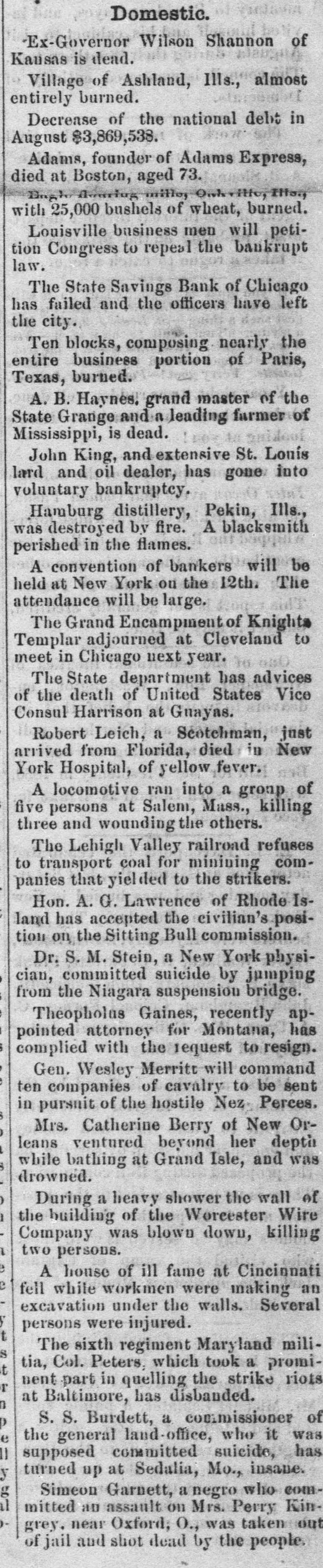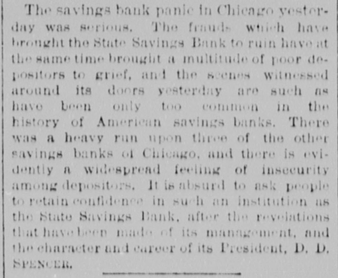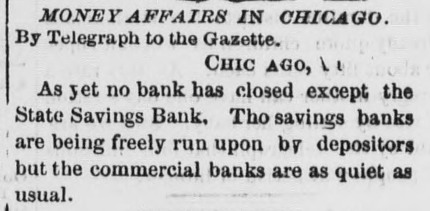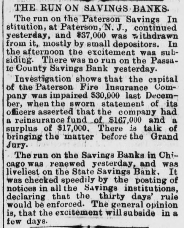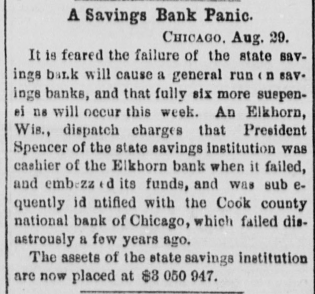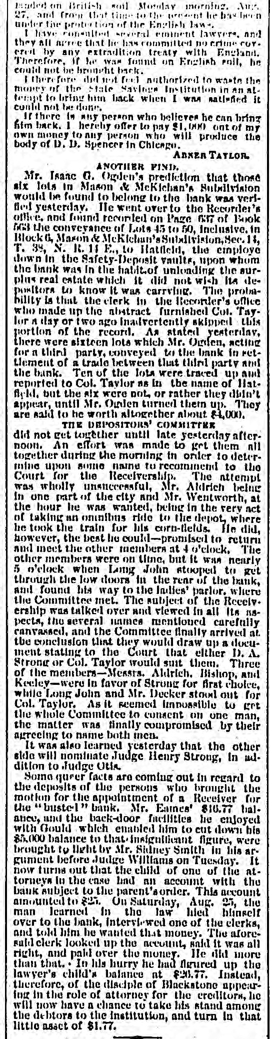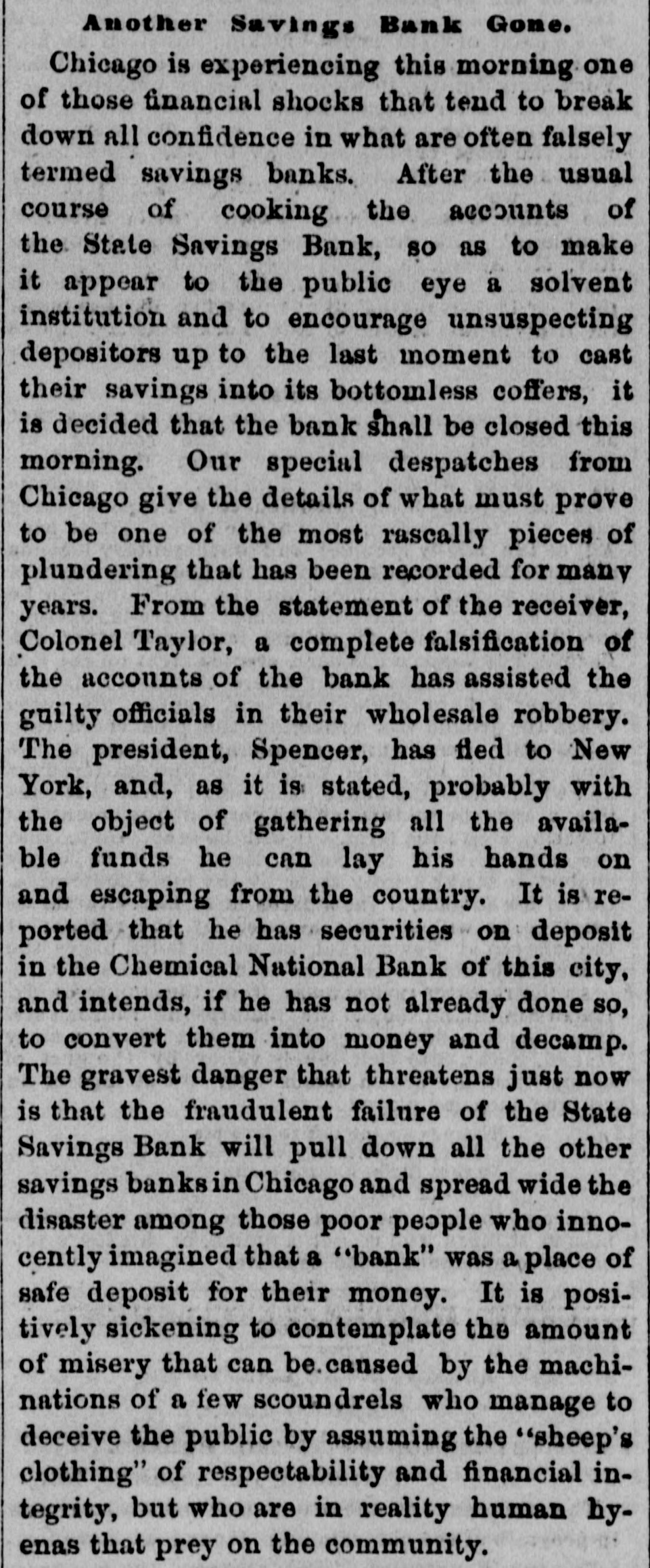 signally defeated. Though sadly crippled since the fire, it was hoped by the management that the Institution would worry through, but the series of sudden failures in St. Louis brought a run upon the quivering bank, which, in an effort to save itself, paid out from $300,000 to $400,000 of its cash means without securing the object sought-the allayingof the excitement. It was finally forced to fall back upon the sixty-day rule, though it has constantly paid out money to needy depositors. This drain, the payment of the half-yearly interest of 3 per cent on $4,000,000 of de posits, and the slow receipts of deposits, conspired to still further weaken the Institution, which, up to July 1, had paid $800,000 over its receipts, and thus parted with the bulk of itecash means. Its assets were of an unfortunate nature. Masses of real estate, which could not be turned owing to the general depression of the market, crippled paper secured by lots whose buildings had been destroyed by the fire, and an enormous amount of unimproved property, taken for debt, and valuable only as it represented a dead loss in the taxes that must be paid, made up the list. The $500,000 capital had been wiped away and the interest of the stockholders extinguished by the hard times that had eaten sadly into the prosperity of the bank, and shrunk it from a live and healthy institution to a pitiful monument of the banking system. It is estimated that nearly one-third of its loans were to mechanics and the salaried class, who borrowed to build homes, and whom the Institution endeavored by every means to assist when the hour of payment found them unable to respond. All this time it preserved its high rate of interest on deposits, notwithstanding the fact that much of its money was idle and its expenses heavy. Perhaps this outline of its affairs will remove any doubt that may exist as to the propriety of the explosion. It is certain that Mr. Spencer did not fully enjoy the confidence of the financial community. His unfortunate experience in the Cook County National, which subsequently landed high and dry, militated against him seriously, and through him against the State Savings. But he managed to stem even this tide until the troubles in St. Louis precipitated the disaster he had hoped to avert. But little could be learned of the condition of the bank for some time before the failure, and this fact, connected with surmises that Mr. Spencer had reasons for suppressing all information, did not tend to the establishment of the confidence he coveted. When the necessity for raising money became absolute, Mr. Spencer went among bankers and said he had $1,000,000 in paper good for its face, $1,000,000 in slow paper, and $1,000,000 in miscellaneous securities. Per contra, his obligations were $3,000,000, and on this showing he wanted $300,000 on such securities as he could afford to part with, claiming that this would enable him to raise from $300,000 to $500,000 in New York, with which he could restore credit. It was readily seen that he would have no first-class securities left, and that the bank must go under by the 1st of January, and bankers concluded that there would be less disappointment if it should fall now than in the winter, when less could be realized on the securities than when the corn was waving, the crops moving, and business generally more brisk. As to the dividends for depositors, Mr. Spencer has claimed that they will reach 75 or 80 per cent., or, under first-class management, 90 per cent., if the paper were sold wisely and slowly, while bad management will reduce them to 60 or 70 per cent. How much really will be realized depends upon the manner in which the vast mass of real estate can be utilized. The question whether the affairs of the bank have been managed dishonestly, or merely imprudently, is asked, and an investigation is awaited anxiously. Mr. Spencer has always been secretive, and has kept the details of his administration to himself. In how far this has been a wise course is left for time to determine. The depositors feel desirous of understanding the matter, even if they receive no other equivalent for their money. From these facts it is manifest that the State Savings Institution was doomed. No general pressure exists upon banking interests, and none was needed to cripple the foundation of this one institution. Flush times might have saved it, but flush times were necessary, and a little pinching. which has not yet affected, and will not affect, the rest, has raised the tombstone of the bank whose vitality has been sadly impaired since the fire.-Chicago Tribune, Aug. 29.
