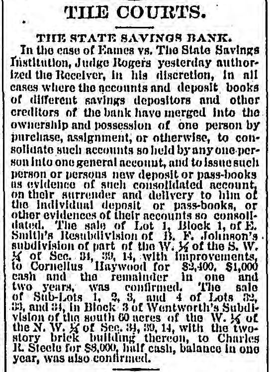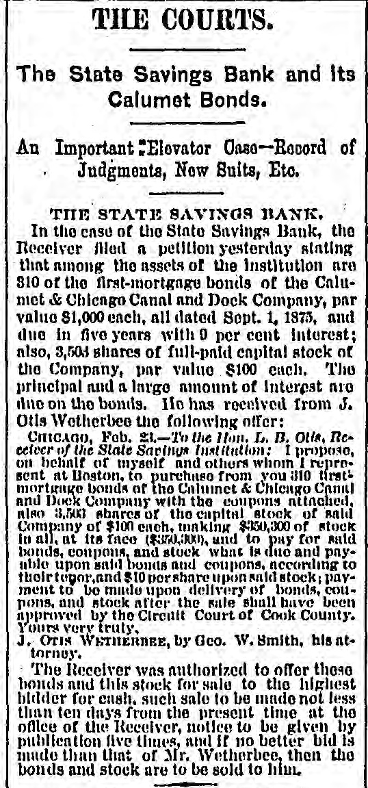 THE COURTS. The State Savings Bank and Its Calumet Bonds. An Important "Elevator Oase-Record of Judgments, Now Suits, Etc. THE STATE SAVINGS BANK. In the case of the State Savings Bank, the Receiver filed n petition yesterday stating that among the assets of the Institution are 310 of the first-mortgage bonds of the Calumet & Chicago Canal and Dock Company, par value $1,000 each, all dated Sept. 1, 1875, and due in five years with 0 per cent Interest; also, 3,503 shares of full-paid capital stock of the Company, par value $100 each. The principal and a large amount of Interest nie due on the bonds. No has received from J. Otls Wetherbee the following offer: CHICAGO, Feb. 23.-To the Hon. L. B. Other Rccelver of the State Savings Institution: I propose, on behalf of myself and others whom I reprosent at Boston, to purchase from you 310 tirstmortgage bonds of the Calumet & Chicago Canal and Dock Company with the coupons attached, also 3,500 shares of the capital stock of said Company of $100 each, making $350,300 of stock In all, at its face ($350,300), and to pay for said bonds, conpons, and stock what is due and payable upon said bonds and coupons, according to their topor, and $10 por share upon said stock; payment to be made upon delivery of bonds, coupons, and stock after the sale shall have been approved by the Circuit Court of Cook County. Yours very truly, J. OTIS WETHERBEE, by Geo. W. Smith, his nttorney. The Receiver was authorized to offer these bonds and this stock for sale to the highest bidder for cash. such sale to be made not less than ten days from the present time at the office of the Receiver, notice to be given by publication five thues, and If no better bid is made than that of Mr. Wetherbee, then the bonds and stock are to be sold to him.