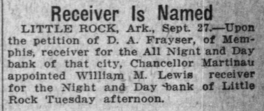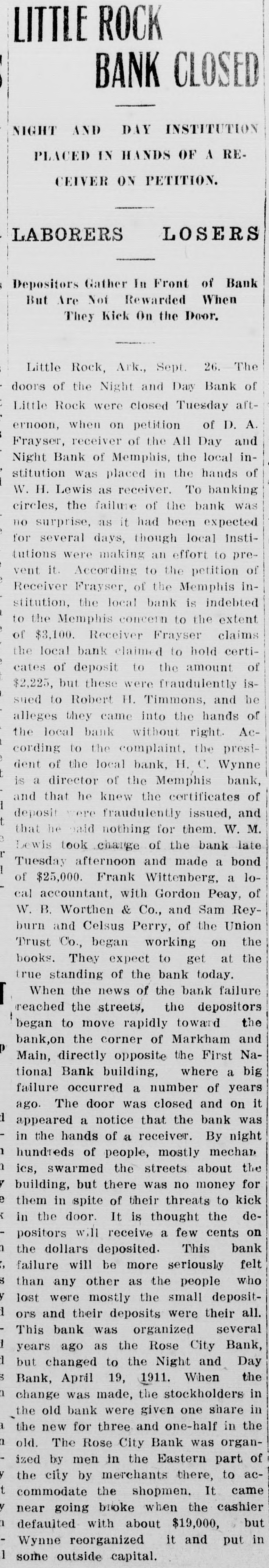 LITTLE ROCK BANK CLOSED NIGHT AND DAY INSTITUTION PLACED IN HANDS OF A RECEIVER ON PETITION. — LABORERS LOSERS Depositors Gather In Front of Bank But Are Not Rewarded When They Kick On the Door. Little Rock, Ark., Sept. 26. The doors of the Night and Day Bank of Little Rock were closed Tuesday afternoon, when on petition of D. A. Frayser, receiver of the All Day and Night Bank of Memphis, the local institution was placed in the hands of W. H. Lewis as receiver. To banking circles, the failure of the bank was no surprise, as it had been expected for several days, though local Institutions were making an effort to prevent it. According to the petition of Receiver Frayser, of the Memphis institution, the local bank is indebted to the Memphis concern to the extent of $3,100. Receiver Frayser claims the local bank claimed to hold certicates of deposit to the amount of $2,225, but these were fraudulently issued to Robert H. Timmons. and he