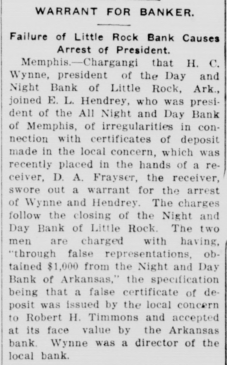 WARRANT FOR BANKER. Failure of Little Rock Bank Causes Arrest of President. Memphis.-Chargangi that H. C. Wynne, president of the Day and Night Bank of Little Rock, Ark., joined E. L. Hendrey, who was president of the All Night and Day Bank of Memphis, of irregularities in connection with certificates of deposit made in the local concern, which was recently placed in the hands of a receiver, D. A. Frayser, the receiver, swore out a warrant for the arrest of Wynne and Hendrey. The charges follow the closing of the Night and Day Bank of Little Rock. The two men are charged with having, "through false representations, obtained $1,000 from the Night and Day Bank of Arkansas," the specification being that a false certificate of deposit was issued by the local concern to Robert H. Timmons and accepted at its face value by the Arkansas bank. Wynne was a director of the local bank.