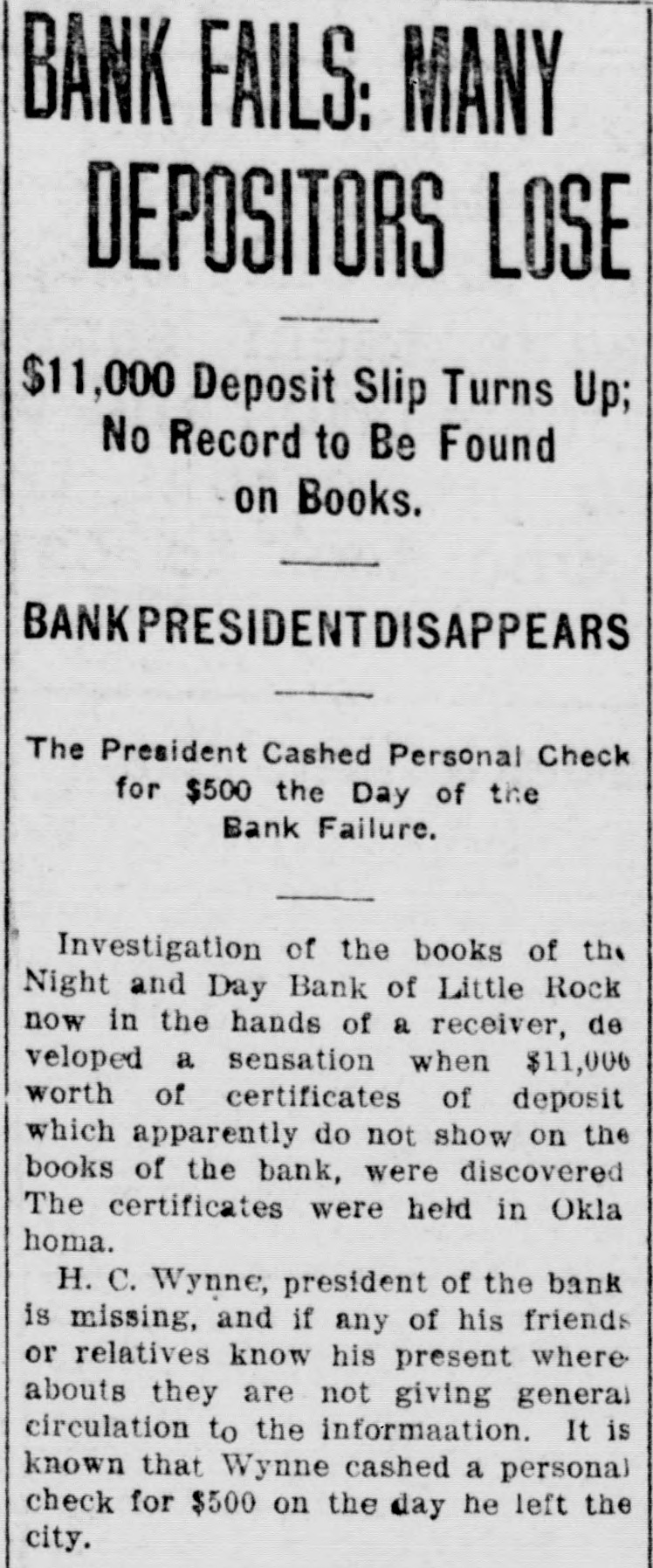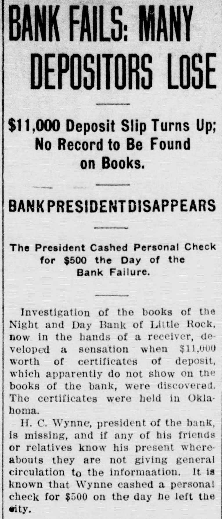 BANK FAILS: MANY DEPOSITORS LOSE $11,000 Deposit Slip Turns Up; No Record to Be Found on Books. BANKPRESIDENTDISAPPEARS The President Cashed Personal Check for $500 the Day of the Bank Failure. Investigation of the books of the Night and Day Bank of Little Rock, now in the hands of a receiver, developed a sensation when $11,000 worth of certificates of deposit, which apparently do not show on the books of the bank, were discovered. The certificates were held in Oklahoma. H. C. Wynne, president of the bank, is missing, and if any of his friends or relatives know his present where abouts they are not giving general circulation to the information. It is known that Wynne cashed a persona! check for $500 on the day he left the city.