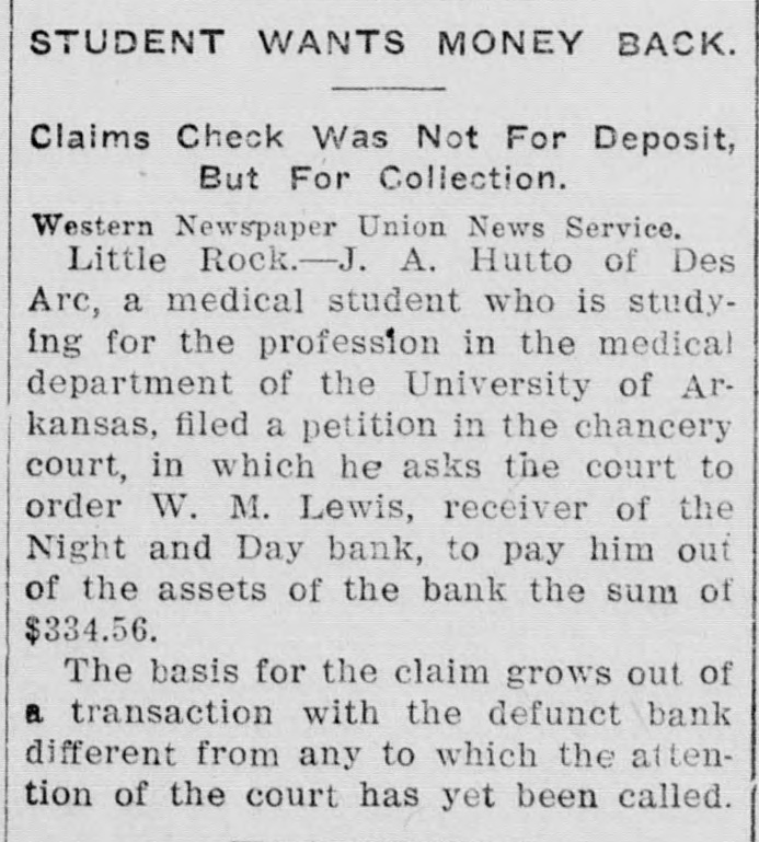 STUDENT WANTS MONEY BACK. Claims Check Was Not For Deposit, But For Collection. Western Newspaper Union News Service. Little Rock.-J. A. Hutto of Des Arc, a medical student who is studying for the profession in the medical department of the University of Arkansas, filed a petition in the chancery court, in which he asks the court to order W. M. Lewis, receiver of the Night and Day bank, to pay him out of the assets of the bank the sum of $334.56. The basis for the claim grows out of a transaction with the defunct bank different from any to which the attention of the court has yet been called.