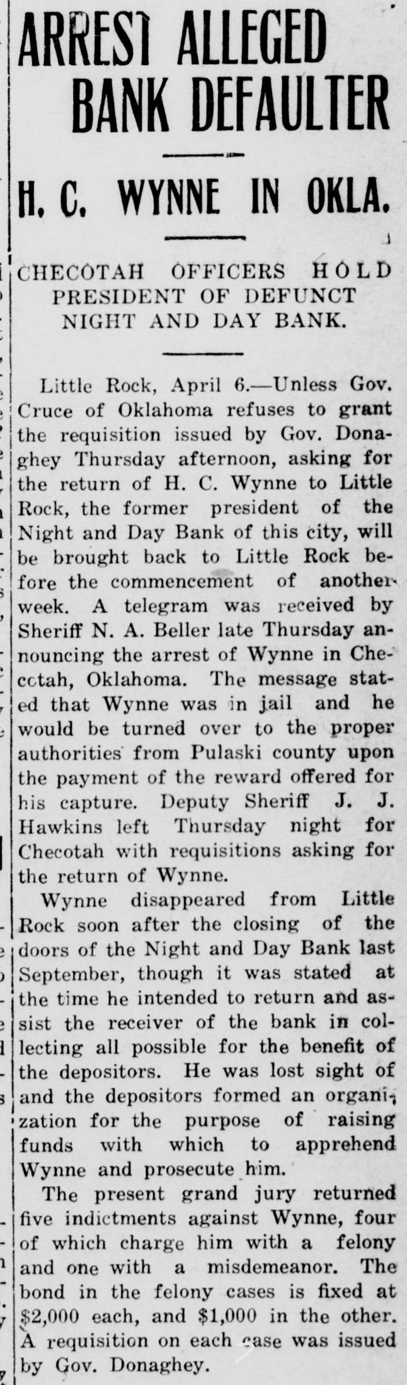 ARREST ALLEGED BANK DEFAULTER H. C. WYNNE IN OKLA. CHECOTAH OFFICERS HOLD PRESIDENT OF DEFUNCT NIGHT AND DAY BANK. Little Rock, April 6.-Unless Gov. Cruce of Oklahoma refuses to grant the requisition issued by Gov. Donaghey Thursday afternoon, asking for the return of H. C. Wynne to Little Rock, the former president of the Night and Day Bank of this city, will be brought back to Little Rock before the commencement of another week. A telegram was received by Sheriff N. A. Beller late Thursday announcing the arrest of Wynne in Checotah, Oklahoma. The message stated that Wynne was in jail and he would be turned over to the proper authorities from Pulaski county upon the payment of the reward offered for his capture. Deputy Sheriff J. J. Hawkins left Thursday night for Checotah with requisitions asking for the return of Wynne. Wynne disappeared from Little Rock soon after the closing of the doors of the Night and Day Bank last September, though it was stated at the time he intended to return and assist the receiver of the bank in collecting all possible for the benefit of the depositors. He was lost sight of and the depositors formed an organi, zation for the purpose of raising funds with which to apprehend Wynne and prosecute him. The present grand jury returned five indictments against Wynne, four of which charge him with a felony and one with a misdemeanor. The bond in the felony cases is fixed at $2,000 each, and $1,000 in the other. A requisition on each case was issued by Gov. Donaghey.