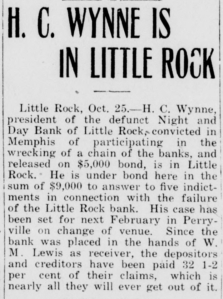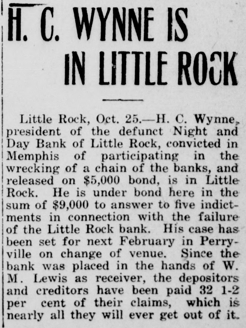Little Rock, Oct. 25.—H. C. Wynne, president of the defunct Night and Day Bank of Little Rock, convicted in Memphis of participating in the wrecking of a chain of the banks, and released on $5,000 bond, is in Little Rock. He is under bond here in the sum of $9,000 to answer to five indictments in connection with the failure of the Little Rock bank. His case has been set for next February in Perryville on change of venue. Since the bank was placed in the hands of W. M. Lewis as receiver, the depositors and creditors have been paid 32 1-2 per cent of their claims, which is nearly all they will ever get out of it.