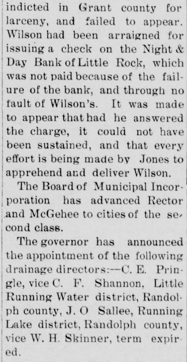 indicted in Grant county for larceny, and failed to appear. Wilson had been arraigned for issuing a check on the Night & Day Bank of Little Rock, which was not paid because of the failure of the bank, and through no fault of Wilson's. It was made to appear that had he answered the charge, it could not have been sustained, and that every effort is being made by Jones to apprehend and deliver Wilson. The Board of Municipal Incorporation has advanced Rector and McGehee to cities of the se, cond class. The governor has announced the appointment of the following drainage directors:-C. E. Pringle, vice C. F. Shannon, Little Running Water district, Randolph county, J. O Sallee, Running Lake district, Randolph county, vice W. H. Skinner, term expired.
