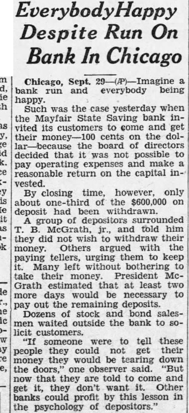 Despite On Bank In Chicago Chicago, Sept. bank run and everybody being happy. Such was the case yesterday when the State Saving bank incustomers and get cents the the board directors decided that possible and reasonable return on the capital vested. By closing time, however, only about of deposit had withdrawn. depositors surrounded McGrath, and him did withdraw their money. Others argued with the paying tellers, urging them to keep Many without take their money. President McGrath estimated that least two would necessary pay out the remaining deposits. Dozens stock and bond waited outside the bank customers. were to tell these people they their would be tearing the doors, observer said. that they told to come and they don't want Other banks could profit by this lesson in the psychology of