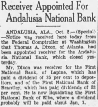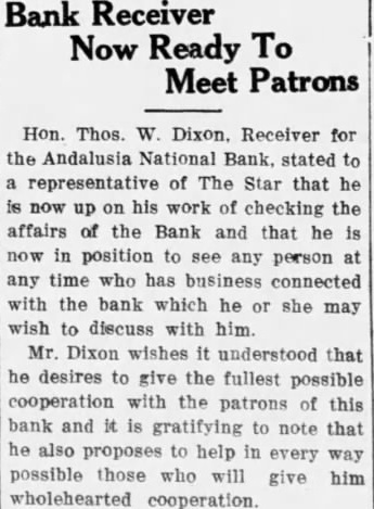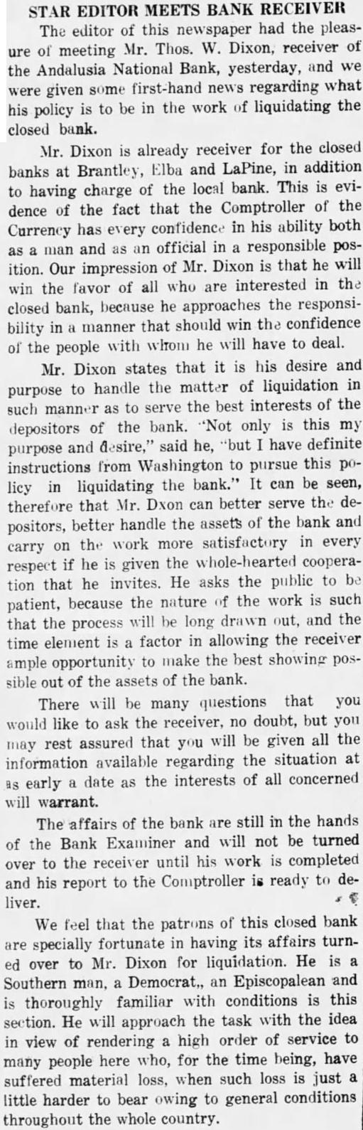 STAR EDITOR MEETS BANK RECEIVER The editor of this newspaper had the pleasure of meeting Mr. Thos. W. Dixon, receiver of the Andalusia National Bank, yesterday, and we were given some first-hand news regarding what his policy is to be in the work of liquidating the closed bank.