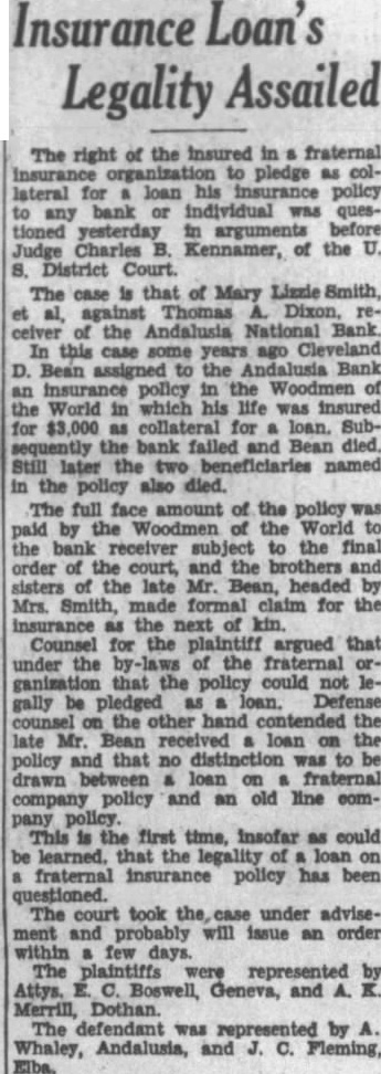 Mr. Dixon is already receiver for the closed banks at Brantley, Elba and LaPine, in addition to having charge of the local bank. This is evidence of the fact that the Comptroller of the Currency has every confidence in his ability both as a man and as an official in a responsible position. Our impression of Mr. Dixon is that he will win the favor of all who are interested in the closed bank, because he approaches the responsibility in manner that should win the confidence of the people with whom he will have to deal. Mr. Dixon states that it is his desire and purpose to handle the matter of liquidation in such manner as to serve the best interests of the depositors of the bank. "Not only is this my purpose and desire," said he, "but have definite instructions from Washington to pursue this policy in liquidating the bank." It can be seen, therefore that Mr. Dxon can better serve the depositors, better handle the assets of the bank and carry on the work more satisfactory in every respect if he is given the whole-hearted cooperation that he invites. He asks the public to be patient, because the nature of the work is such that the process will be long drawn out, and the time element is a factor in allowing the receiver ample opportunity to make the best showing possible out of the assets of the bank. There be many questions that you would like to ask the receiver, no doubt, but you may rest assured that you will be given all the information available regarding the situation at as early date as the interests of all concerned will warrant.