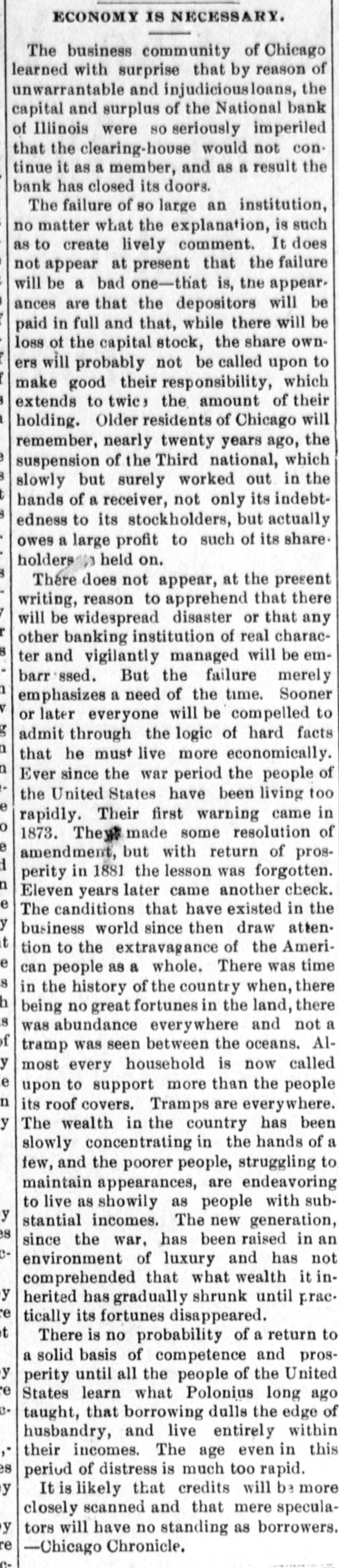 ECONOMY IS NECESSARY. The business community of Chicago learned with surprise that by reason of unwarrantable and injudiciousloans, the capital and surplus of the National bank of Illinois were so seriously imperiled that the clearing-house would not continue it as a member, and as a result the bank has closed its doors. The failure of so large an institution, no matter what the explanation, is such as to create lively comment. It does not appear at present that the failure will be a bad one-that is, the appearances are that the depositors will be paid in full and that, while there will be loss of the capital stock, the share owners will probably not be called upon to make good their responsibility, which extends to twice the amount of their holding. Older residents of Chicago will remember, nearly twenty years ago, the suspension of the Third national, which slowly but surely worked out in the hands of a receiver, not only its indebtedness to its stockholders, but actually owes a large profit to such of its share. holders held on. There does not appear, at the present writing, reason to apprehend that there will be widespread disaster or that any other banking institution of real character and vigilantly managed will be embarr ssed. But the failure merely emphasizes a need of the time. Sooner or later everyone will be compelled to admit through the logic of hard facts a that he must live more economically. a Ever since the war period the people of the United States have been living too e rapidly. Their first warning came in 1873. The made some resolution of e amendment, but with return of prosperity in 1881 the lesson was forgotten. n Eleven years later came another check. e The canditions that have existed in the y business world since then draw attent tion to the extravagance of the Amerie can people as a whole. There was time S in the history of the country when, there h being no great fortunes in the land, there S was abundance everywhere and not a tramp was seen between the oceans. Aly most every household is now called e upon to support more than the people n its roof covers. Tramps are everywhere. y The wealth in the country has been slowly concentrating in the hands of a few, and the poorer people, struggling to maintain appearances, are endeavoring to live as showily as people with suby stantial incomes. The new generation, es since the war, has been raised in an Cenvironment of luxury and has not comprehended that what wealth it iny herited has gradually shrunk until pracre tically its fortunes disappeared. t There is no probability of a return to a solid basis of competence and prosy perity until all the people of the United e States learn what Polonius long ago etaught, that borrowing dulls the edge of husbandry, and live entirely within their incomes. The age even in this es period of distress is much too rapid. y It is likely that credits will be more closely scanned and that mere speculay tors will have no standing as borrowers. re -Chicago Chronicle. C=