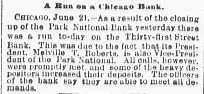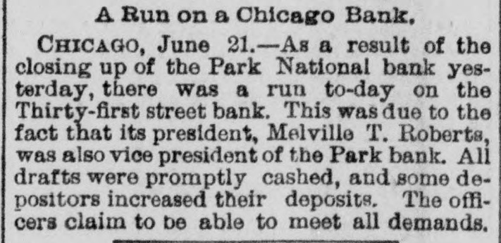 A Run on a Chicago Bank, CHICAGO, June 21.-As a result of the closing up of the Park National bank yesterday, there was a run to-day on the Thirty-first street bank. This was due to the fact that its president, Melville T. Roberts, was also vice president of the Park bank. All drafts were promptly cashed, and some depositors increased their deposits. The officers claim to be able to meet all demands,