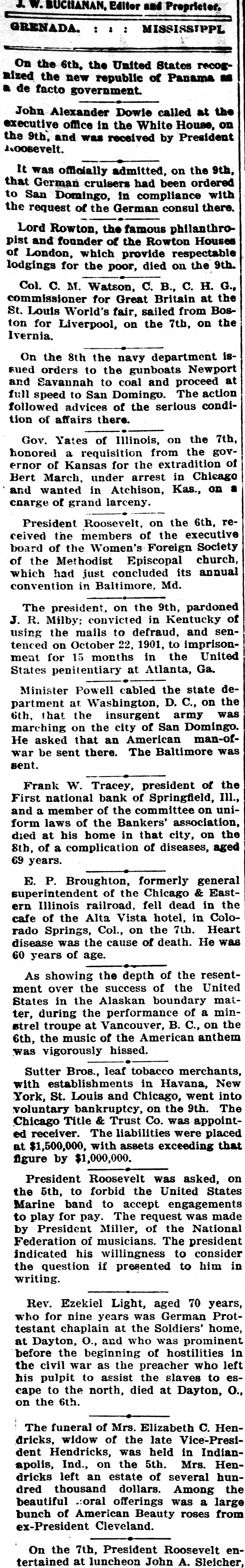BUCHANAN, Editor and Preprieter. GRENADA. : MISSISSIPPL On the 6th, the United States recogmized the new republic of Panama as a de facto government. John Alexander Dowie called at the executive office in the White House, on the 9th, and was received by President Loosevelt. It was officially admitted, on the 9th, that German cruisers had been ordered to San Domingo, in compliance with the request of the German consul there. Lord Rowton, the famous philanthrothe of which pist London, and founder of provide Rowton respectable Houses lodgings for the poor, died on the 9th. Col. C. M. Watson, C. B., C. H. G., the commissioner Louis World's for fair, Great sailed Britain from at St. Boston for Liverpool, on the 7th, on the Ivernia. On the 8th the navy department issued orders to the gunboats Newport and Savannah to coal and proceed at full speed to San Domingo. The action followed advices of the serious condition of affairs there. Gov. Yates of Illinois, on the 7th, honored a requisition from the governor of Kansas for the extradition of Bert March, under arrest in Chicago and wanted in Atchison, Kas., on a cnarge of grand larceny. President Roosevelt, on the 6th, received the members of the executive Women's Foreign of board the of Methodist the Episcopal church, Society annual which had just concluded its convention in Baltimore, Md. The president, on the 9th, pardoned J. convicted in R. Milby; defraud, Kentucky and of using the mails to senOctober 22, 1901, to imprison15 months in ment tenced for on the United States penitentiary at Atlanta, Ga. Minister Powell cabled the state department at Washington, D. C., on the 6th, that the insurgent army was marching on the city of San Domingo. He asked that an American man-ofwar be sent there. The Baltimore was sent. Frank W. Tracey, president of the First national bank of Springfield, Ill., and a member of the committee on uniform laws of the Bankers' association, died at his home in that city, on the 8th, of a complication of diseases, aged 69 years. E. P. Broughton, formerly general superintendent of the Chicago & Eastern Illinois railroad, fell dead in the cafe of the Alta Vista hotel, in Colorado Springs, Col., on the 7th. Heart disease was the cause of death. He was 60 years of age. As showing the depth of the resentment over the success of the United States in the Alaskan boundary matter, during the performance of a minat Vancouver, on music of the strel 6th, the troupe American B. C., anthem the was vigorously hissed. Sutter Bros., leaf tobacco merchants, in St. Louis and on York, voluntary with establishments bankruptcy, Chicago, Havana, the went 9th. New into The Title & Trust was The were Chicago ed receiver. liabilities Co. appoint- placed that at $1,500,000, with assets exceeding figure by $1,000,000. President Roosevelt was asked, on the 5th, to forbid the United States Marine band to accept engagements to for The was President Miller, of by play pay. request the National made Federation of musicians. The president indicated his willingness to consider the question if presented to him in writing. Rev. Ezekiel Light, aged 70 years, who for nine years was German Prottestant chaplain at the Soldiers' home, at and who was Dayton, O., beginning of hostilities prominent before the in the civil war as the preacher who left his to assist espulpit died the at slaves Dayton, to O., cape to the north, on the 6th. The funeral of Mrs. Elizabeth C. Henwidow of the dent was dricks, Hendricks, held late Vice-Presi- in Indianapolis, Ind., on the 5th. Mrs. Hendricks left an estate of several hundred thousand dollars. Among the beautiful oral offerings was a large bunch of American Beauty roses from ex-President Cleveland. On the 7th, President Roosevelt entertained at luncheon John A. Sleicher,