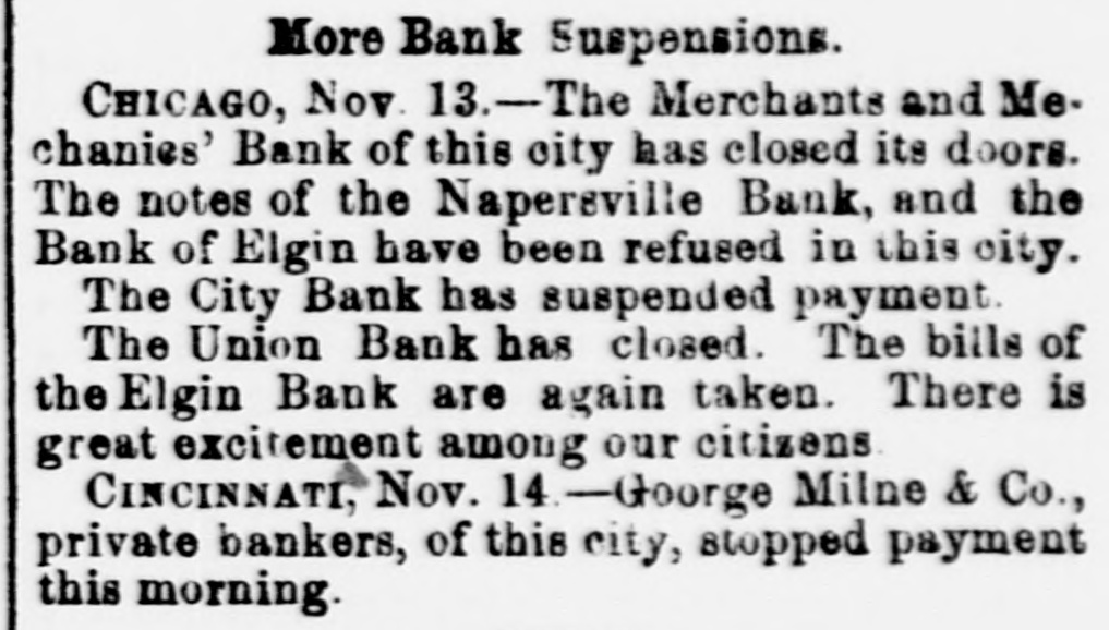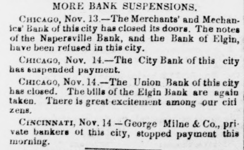 MORE BANK SUSPENSIONS. CHICAGO, Nov. 13-The Merchants' and Mechanice' Bank of this city has closed its doors. The notes of the Napersville Bank, and the Bank of Elgin, have been refused in this city. CHICAGO, Nov. 14.-The City Bank of this city has suspended payment. CHICAGO, Nov. 14.-The Union Bank of this city has closed. The bills of the Elgin Bank are again taken. There is great excitement among our citi zens. CINCINNATI, Nov. 14 -George Milne & Co., private bankers of this city, stopped payment this morning.
