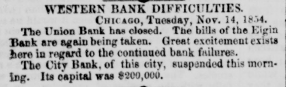SUSPENSION OF THE CITY BANK OF CHICAGO. CHICAGO, Nov. 14, 1854. The City Bank of this city this morning suspended. ... WESTERN BANK DIFFICULTIES. CHICAGO, Nov. 14, 1854. The Union Bank has closed.