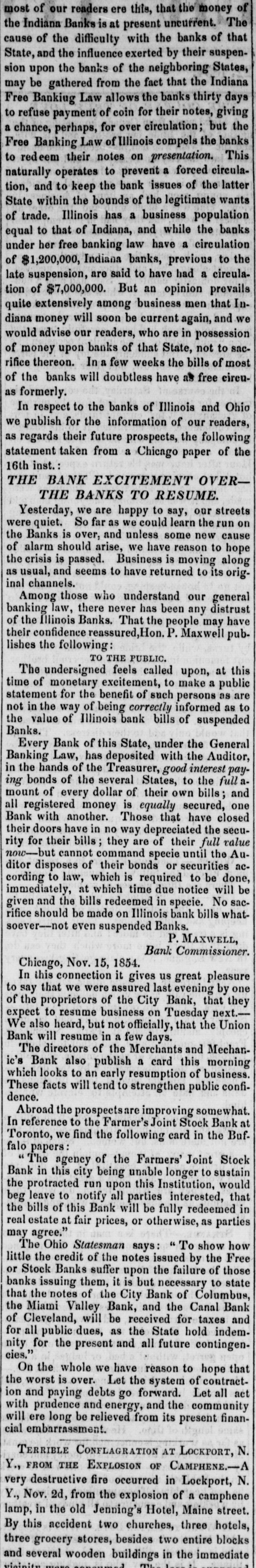 most of our readers ere this, that the money of the Indiana Banks is at present uncurrent. The cause of the difficulty with the banks of that State, and the influence exerted by their suspension upon the banks of the neighboring States, may be gathered from the fact that the Indiana Free Bankiug Law allows the banks thirty days to refuse payment of coin for their notes, giving a chance, perhaps, for over circulation; but the Free Banking Law of Illinois compels the banks to redeem their notes on presentation. This naturally operates to prevent a forced circulation, and to keep the bank issues of the latter State within the bounds of the legitimate wants of trade. Illinois has a business population equal to that of Indiana, and while the banks under her free banking law have a circulation of $1,200,000, Indiana banks, previous to the late suspension, are said to have had a circulation of $7,000,000. But an opinion prevails quite extensively among business men that Indiana money will soon be current again, and we would advise our readers, who are in possession of money upon banks of that State, not to sacrifice thereon. In a few weeks the bills of most of the banks will doubtless have as free circu- as formerly. In respect to the banks of Illinois and Ohio we publish for the information of our readers, as regards their future prospects, the following statement taken from a Chicago paper of the 16th inst.: # THE BANK EXCITEMENT OVER- # THE BANKS TO RESUME. Yesterday, we are happy to say, our streets were quiet. So far as we could learn the run on the Banks is over, and unless some new cause of alarm should arise, we have reason to hope the crisis is passed. Business is moving along as usual, and seems to have returned to its original channels. Among those who understand our general banking law, there never has been any distrust of the Illinois Banks. That the people may have their confidence reassured, Hon. P. Maxwell publishes the following: TO THE PUBLIC. The undersigned feels called upon, at this time of monetary excitement, to make a public statement for the benefit of such persons as are not in the way of being correctly informed as to the value of Illinois bank bills of suspended Banks. Every Bank of this State, under the General Banking Law, has deposited with the Auditor, in the hands of the Treasurer, good interest paying bonds of the several States, to the full amount of every dollar of their own bills; and all registered money is equally secured, one Bank with another. Those that have closed their doors have in no way depreciated the security for their bills; they are of their full value now-but cannot command specie until the Auditor disposes of their bonds or securities according to law, which is required to be done, immediately, at which time due notice will be given and the bills redeemed in specie. No sacrifice should be made on Illinois bank bills whatsoever--not even suspended Banks. P. MAXWELL, Bank Commissioner. Chicago, Nov. 15, 1854. In this connection it gives us great pleasure to say that we were assured last evening by one of the proprietors of the City Bank, that they expect to resume business on Tuesday next.-- We also heard, but not officially, that the Union Bank will resume in a few days. The directors of the Merchants and Mechanic's Bank also publish a card this morning which looks to an early resumption of business. These facts will tend to strengthen public confidence. Abroad the prospects are improving somewhat. In reference to the Farmer's Joint Stock Bank at Toronto, we find the following card in the Buffalo papers: "The agency of the Farmers' Joint Stock Bank in this city being unable longer to sustain the protracted run upon this Institution, would beg leave to notify all parties interested, that the bills of this Bank will be fully redeemed in real estate at fair prices, or otherwise, as parties may agree." The Ohio Statesman says: "To show how little the credit of the notes issued by the Free or Stock Banks suffer upon the failure of those banks issuing them, it is but necessary to state that the notes of the City Bank of Columbus, the Miami Valley Bank, and the Canal Bank of Cleveland, will be received for taxes and for all public dues, as the State hold indemnity for the present and all future contingencies." On the whole we have reason to hope that the worst is over. Let the system of contraction and paying debts go forward. Let all act with prudence and energy, and the community will ere long be relieved from its present financial embarrassment. # TERRIBLE CONFLAGRATION AT LOCKPORT, N. Y., FROM THE EXPLOSION OF CAMPHENE. A very destructive fire occurred in Lockport, N. Y., Nov. 2d, from the explosion of a camphene lamp, in the old Jenning's Hotel, Maine street. By this accident two churches, three hotels, three grocery stores, besides two entire blocks and several wooden buildings in the immediate