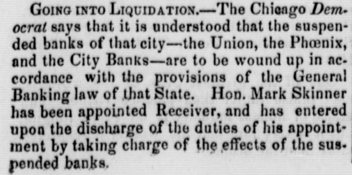 Illinois SUSPENDED Banks.-The Chicago Democratic Press ... says: The banks that have gone into liquidation are the Union Bank, City Bank, Farmers' Bank and Phoenix Bank, all of Chicago ...