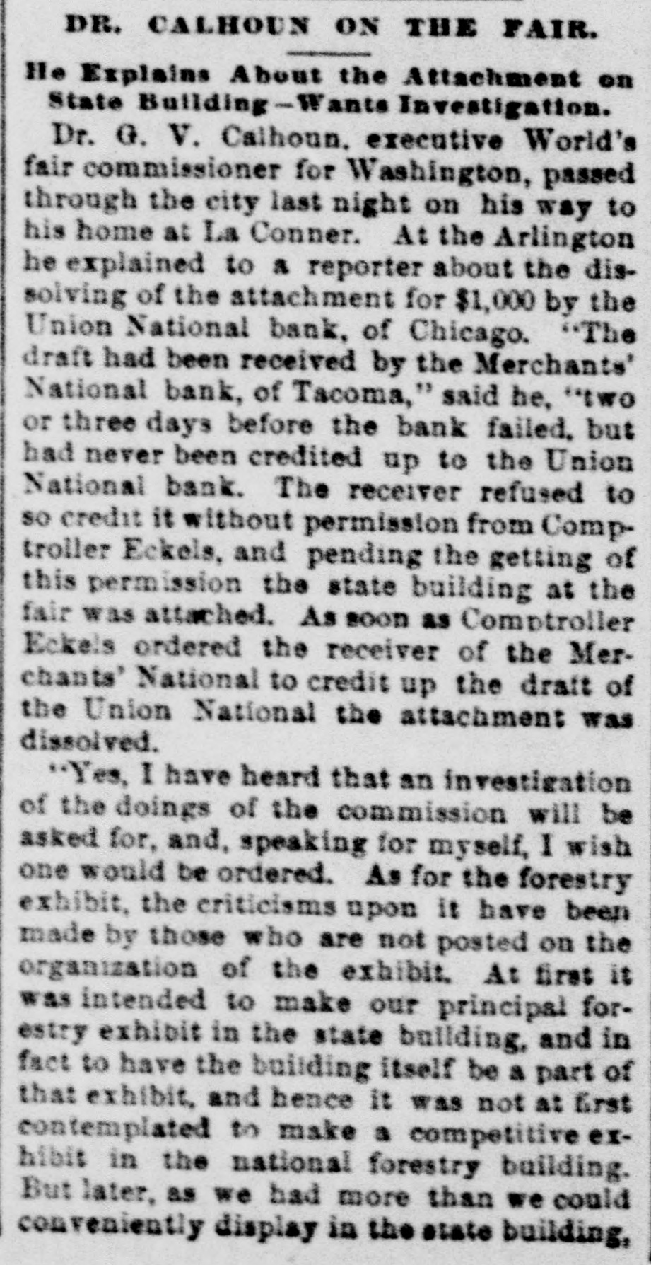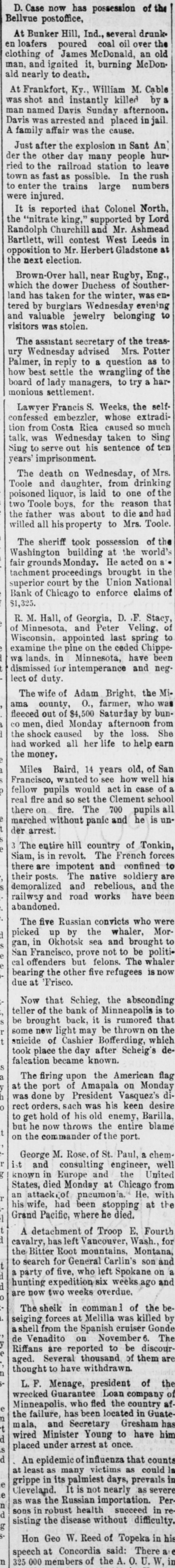 D. Case now has possession of the Bellvue postoffice, At Bunker Hill, Ind., several drunk. en loafers poured coal oil over the clothing of James McDonald, an old man, and ignited it, burning McDon. ald nearly to death. At Frankfort, Ky., William M. Cable was shot and instantly killed by a man named Davis Sunday afternoon. Davis was arrested and placed in jail. A family affair was the cause. Just after the explosion in Sant An' der the other day many people hurried to the railroad station to leave town as fast as possible. In the rush to enter the trains large numbers were injured. It is reported that Colonel North, the "nitrate king," supported by Lord Randolph Churchill and Mr. Ashmead Bartlett, will contest West Leeds in opposition to Mr. Herbert Gladstone at the next election. Brown-Over hall, near Rugby, Eng., which the dower Duchess of Southerland has taken for the winter, was entered by burglars Wednesday evening and valuable jewelry belonging to visitors was stolen. The assistant secretary of the treasury Wednesday advised Mrs. Potter Palmer, in reply to a question as to how best settle the wrangling of the board of lady managers, to try a harmonious settlement. Lawyer Francis S. Weeks, the selfconfessed embezzler, whose extradition from Costa Rica caused so much talk, was Wednesday taken to Sing Sing to serve out his sentence of ten years' imprisonment. The death on Wednesday, of Mrs. Toole and daughter, from drinking poisoned liquor, is laid to one of the two Toole boys, for the reason that the father was about to die and had willed all his property to Mrs. Toole. The sheriff took possession of the Washington building at the world's fair grounds Monday. He acted on a tachment proceedings brought in the superior court by the Union National Bank of Chicago to enforce claims of R. M. Hall, of Georgia, D. F. Stacy, of Minnesota, and Peter Veling, of Wisconsin, appointed last spring to examine the pine on the ceded Chippewa lands. in Minnesota, have been -Seu pue JOJ distinsed lect of duty. The wife of Adam Bright, the Miama county, O., farmer, who was -unq 4q $4,500 JO not deceed CO men, died Monday afternoon from the shock caused by the loss. She had worked all her life to help earn the money, Miles Baird, 14 years old, of San Francisco, wanted to see how well his fellow pupils would act in case of real fire and so set the Clement school there on fire. The 700 pupils all marched without panic and he is under arrest. 3 The entire hill country of Tonkin, Siam, is in revolt. The French forces there are impotent and confined to their posts. The native soldiery demoralized and rebelious, and the railway and road works have been abandoned. The five Russian convicts who were picked up by the whaler, Morgan, in Okhotsk sea and brought to San Francisco, prove not to be political offenders but felons. The whaler bearing the other five refugees is now due at 'Frisco. Now that Schieg, the absconding teller of the bank of Minneapolis is to be brought back, it is rumored that some new light may be thrown on the suicide of Cashier Bofferding, which took place the day after Scheig's falcation became known. The firing upon the American flag at the port of Amapala on Monday was done by President Vasquez's direct orders. sach was his keen desire to get hold of his old enemy, Barilla, but he now throws the entire blame on the commander of the port. George M. Rose. of St. Paul, a chemist and consulting engineer, well known in Europe and the United States, died Monday at Chicago from an attack.of pneumonia. He. with his wife, had been stopping at the Grand Pacific, where he died. A detachment of Troop E. Fourth cavalry, has left Vancouver, Wash., for the Bitter Root mountains, Montana, to search for General Carlin's son and uo Spokene ter очм 'eay JO Party 8 hunting expedition weeks ago and P are now two weeks overdue. The sheik in command of the beseiging forces at Melilla was killed by ashell from the Spanish cruiser Gonde de Venadito on November 6. The Riffans are reported to be discouraged. Several thousand of them thought to have withdrawn. u L. F. Menage, president of the wrecked Guarantee Loan company of Minneapolis, who fled the country afthe failure, has been located in Guateu mala, and Secretary Gresham has 7. wired Minister Young to have him p placed under arrest at once. p An epidemic ofinfluenza that counts at least as many victims as could grippe in its palmiest days, prevails