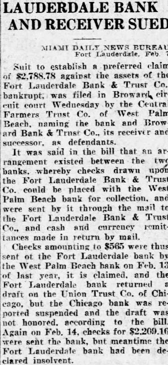 LAUDERDALE BANK AND RECEIVER SUED MIAMI DAILY NEWS BUREAU Fort Suit to establish preferred claim bankrupt. was filed in Broward cirenit court Wednesday by the Central Farmers Trust Co. West Palm Beach. naming the bank and Brow ard Bank & Trust Co., its receiver and It was said in the bill that an arrangement existed between the two banks. whereby checks drawn upon the Fort Landerdale Bank & Trust Co. could placed with the West Palm Beach bank for collection. and by the mail to the Fort Landerdale Bank & Trust Co., and cash and currency remitin return by mail. $565 thus sent ot the Fort Landerdale bank by the West Palm Beach bank on Feb. 13 of last year, it is claimed. and the Fort Landerdale bank returned draft on the Union Trust Co. of Chicago, but the Chicago bank was reported suspended and the draft was not honored. according to the bill. Again on Feb. 14. checks for $2,209.16 were sent the bank, but meantime the Fort Lauderdate bank had been declared insolvent.