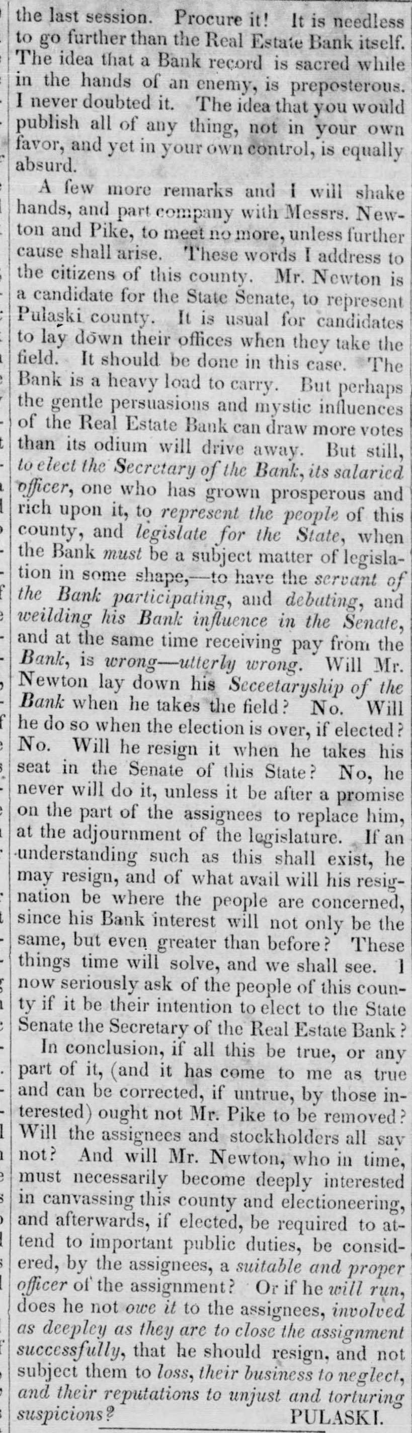 the last session. Procure it! It is needless to go further than the Real Estate Bank itself. The idea that a Bank record is sacred while in the hands of an enemy, is preposterous. I never doubted it. The idea that you would publish all of any thing, not in your own favor, and yet in your own control, is equally absurd. A few more remarks and I will shake hands, and part company with Messrs. Newton and Pike, to meet no more, unless further cause shall arise. These words I address to is a to the candidate citizens for of this the State county. Senate, Mr. Newton represent Pulaski county. It is usual for candidates to lay down their offices when they take the field. It should be done in this case. The Bank is a heavy load to carry. But perhaps the gentle persuasions and mystic influences of the Real Estate Bank can draw more votes than its odium will drive away. But still, to elect the Secretary of the Bank, its salaried one upon to the of this the when officer, rich county, and it, who legislate represent has grown for prosperous people State, and the Bank must be a matter of some have the servant tion in shape,-to subject legisla- of the Bank participating, and debuting, and weilding his Bank influence in the Senate, and at the same time receiving pay from the Will the Newton Bank Bank, is lay wrong-utterly down his Seceetaryship wrong. of Mr. when he takes the field? No. Will he do so when the election is if elected? it when he his No. Will he resign over, takes seat in the Senate of this State? No, he never will do it, unless it be after a promise on the part of the assignees to replace him, at the adjournment of the If an as this shall he avail will his understanding may resign, and such of what legislature. exist, resignation be where the people are concerned, since his Bank interest will not only be the same, but even greater than before? These things time will solve, and we shall see. 1 now seriously ask of the people of this county if it be their intention to elect to the State Senate the Secretary of the Real Estate Bank In conclusion, if all this be true, or any part of it, (and it has come to me as true and can be corrected, if untrue, by those interested) ought not Mr. Pike to be removed Will the assignees and stockholders all sav not? And will Mr. Newton, who in time, must necessarily become deeply interested and be to atand in canvassing afterwards, this if county elected, required electioneering, tend to important public duties, be considered, by the assignees, a suitable and proper officer of the assignment? Or if he will run, does he not owe it to the assignees, involved as deepley as they are to close the assignment successfully, that he should resign, and not subject them to loss, their business to neglect, and their reputations to unjust and torturing suspicions ? PULASKI.
