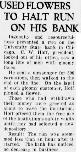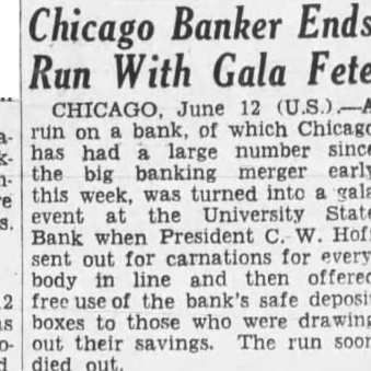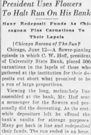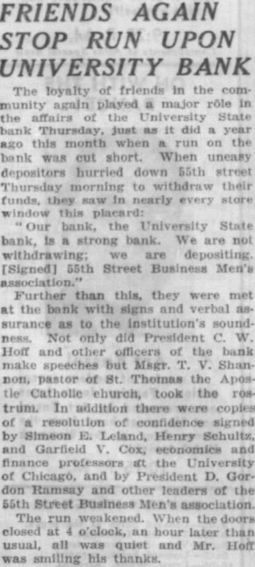 The loyalty of friends in the community again played major role in the of State just did year ago this month when run the bank was cut short. When uneasy depositors hurried down 55th street Thursday morning withdraw their funds, in nearly every store window this placard: bank, the University State bank, is strong bank. We are not withdrawing; [Signed] 55th Street Business Men's Further than this, they were met at the bank with signs and verbal assurance as to the Institution's soundNot only did President Hoff and other officers the bank make speeches but Msgr. Shannon, pastor Thomas the Aposchurch, took the rostrum. In addition there copies resolution signed Simeon E. Henry Schultz, and Garfield V. Cox, and the of Chicago, and by D. Gor don Ramsay and other leaders the 55th Street Business The run weakened. the doors closed o'clock, hour later than usual, all was quiet and Mr. Hoff was his thanks.
