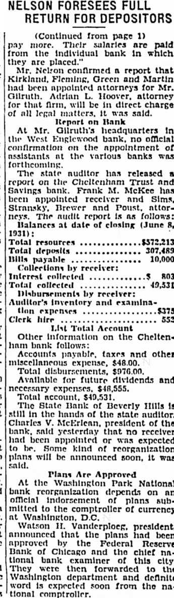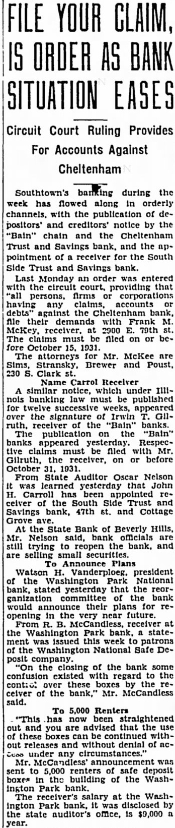 (Depesza Własna) rano zamknał swe podwoje "The North Western Trust and Savings Bank", który został założony niemal éwieré wieku temu przez Jana F. Smulskiego. Tysiące depozytarjuszów stoi dziś przed bankiem, domagając się wypłaty deponowanych sum, lecz bez skutku, gdyż bank jest W rękach urzędników stanowych wszelka wypłata depozytów Zamknięcie banku spowodowane było przez nagly "run" na bank dniu wezorajszym. Gdy dziś run trwał W dalszym ciągu władze stanowe objely bank posiadanie wstrzymały wypłaty. Dyrekcya Banku wydała oświadczenie, ze jest pewna, ze wszelkie należytości będą wypłacone W zupełności W przeciągu 90 dni kiedy spodziewają się, iz kwidacya będzie dokonana. Chodzą pogłoski, iż śladem banku Northwestern pójdą inne banki chicagoskie. Bank North Western byt pierwszym bankiem polskim W Ameryce i należał do W ostatnich dwóch dniach zamknięto 20 banków Chicago. A dzis oprócz Banku Northwestern zytow do ostatniego dolara. gdyby wymagala tego konieczność.Ale zaden Bank ,bez względu na to jak wielki bogaty, nie może jednym dniu czy tygodniu wy dac wszystkich depozytów, jesli chce normalnie sie zystować, wha tow znajdowała sie W kasie banku. Reszte zdobywa sie sprzedazy bondów, zwrotu pożyczek innych wpływów, które przychodzą normalnie, biegiem czasu, lecz nie jednym dniu lub godzinie. dlatego wyjątkowej sy tuacji, jak obecna, prawo pozwala ograniczenie natychmiasto wej wyplaty depozytów na pewien okreslony czas. To wlasnie czyni sie obecnie W naszym Banku. Tymczasem, aby ulzyc rodzinom wogóle osobom, pozwalamy na wyciąganie pewnej sumy oszczedności, po trzebnej dla normalnego życia domowego wedlug uznania urzędnikew bankowych. Zatem dla Waszego własnego dobra prosimy Was wsrystkich cierpiiwość wspólprace dzisiaj." Następujące banki zostaly zaFirst North Western State Bank, Second North Western Bank Inland State Bank. wszystkie trzy tak zwane Smulskiego banki. Cheltenham Trust Company, Industrial State Bank, Sheridan State Bank, South Side Trust, Washington Park National, Armitage State, Auburn Park Trust Company, Breinard State Bank, Bryn Mawr Bank, Chatham State Bank, Chicago Loan Bank, Elston State Bank, Rich State Bank, Stone Illinois State Bank, West Engleton State Bank, West Highland State Bank, West Lane State Bank. Jest wiadomem, 12 W Banku Northwestern mialy depozyty najwieksze polskie organizacye, jak N. Zwiazek Polek, Zjednoczenie inne. Wszystkie pieniadze Konsulatu Polskiego Chicago lokowane byly W banku Smulskiego. Dziennik dla Wszystkich rozmowie Henclem, skarbnikiem Związku N. zyt ZNP. W Northwestern Banku innych zamknietych nie prze wyższał sumy $25,000 ze to sume spodziewają sie odebrać W calości po Sa pogłoski, iz Zjedn. P. R. K. zdołało wyciagnac większą czesc swoich depozytów przed zamknię ciem Banku North Western, tak, dzie sie bez straty. Do tego czasu Dziennik nie mógł sie skomunikować zarządem Związku Podowiedzieć się 0 stanie ich depozytów W zamkniętych bankach. Dzis calem Chicago panuje chaos thumy ludzi przed kazdym bankiem, nie tylko tak zwanym Loup, ale mieściu. Wszedzie domagaja sie wyplaty depozytów. Nawet kolosalny First National Bank, wezoraj uratował tak zwane man Banks" przechodzi